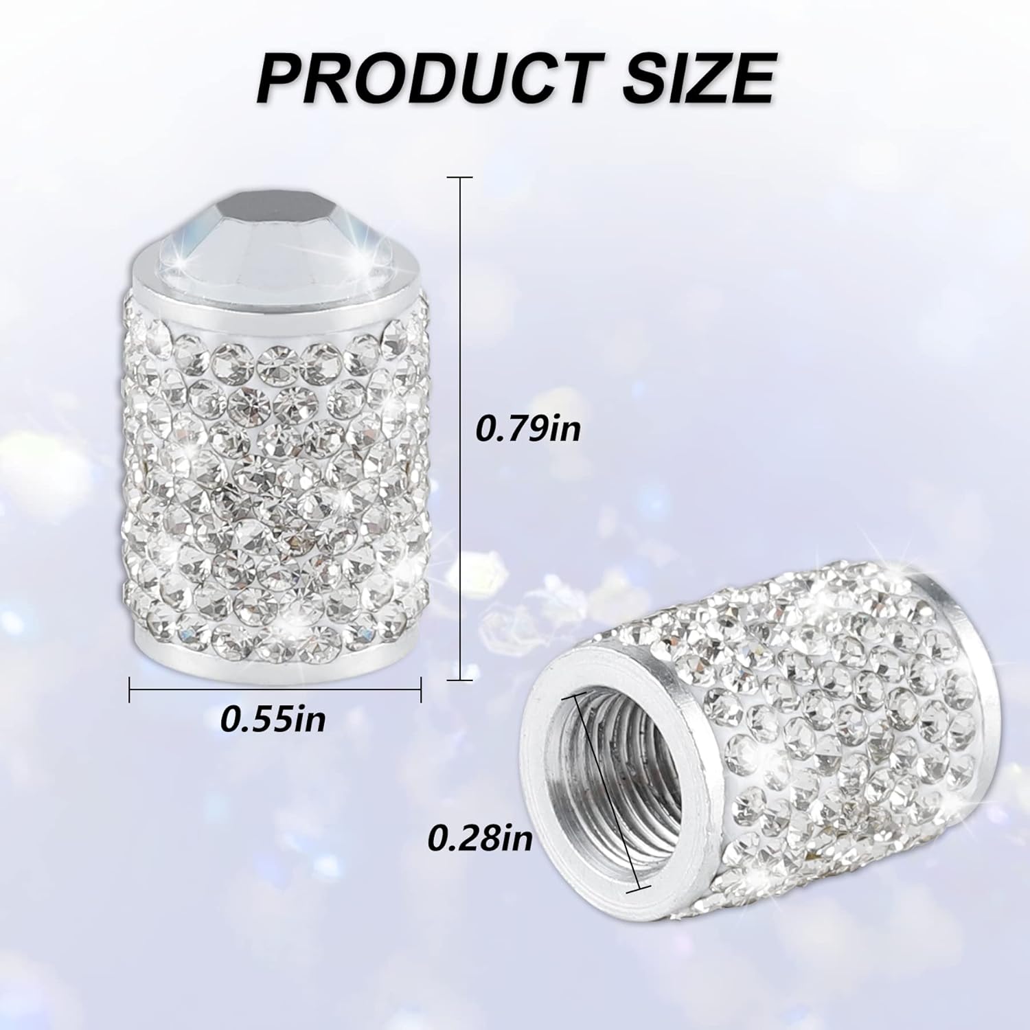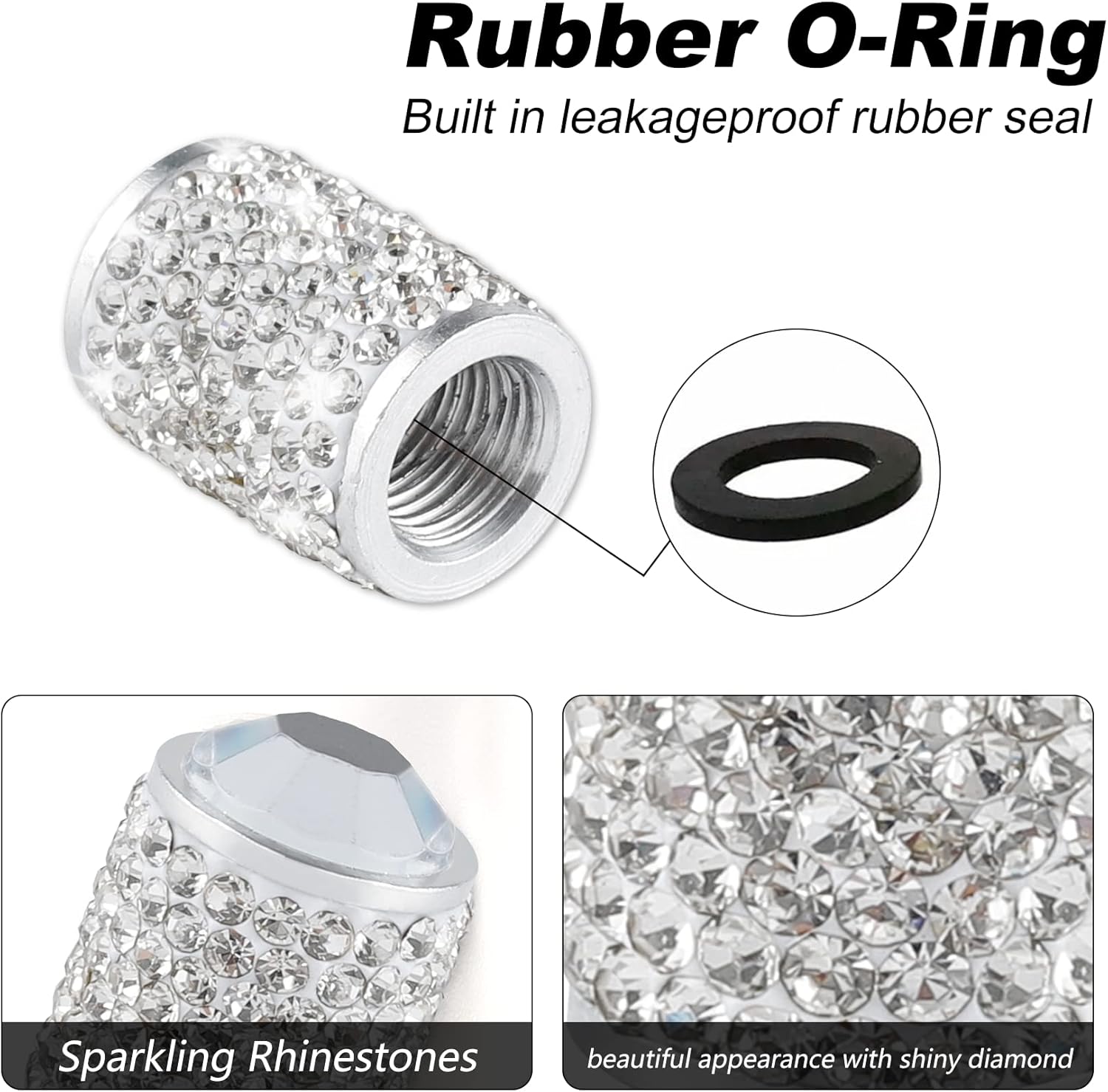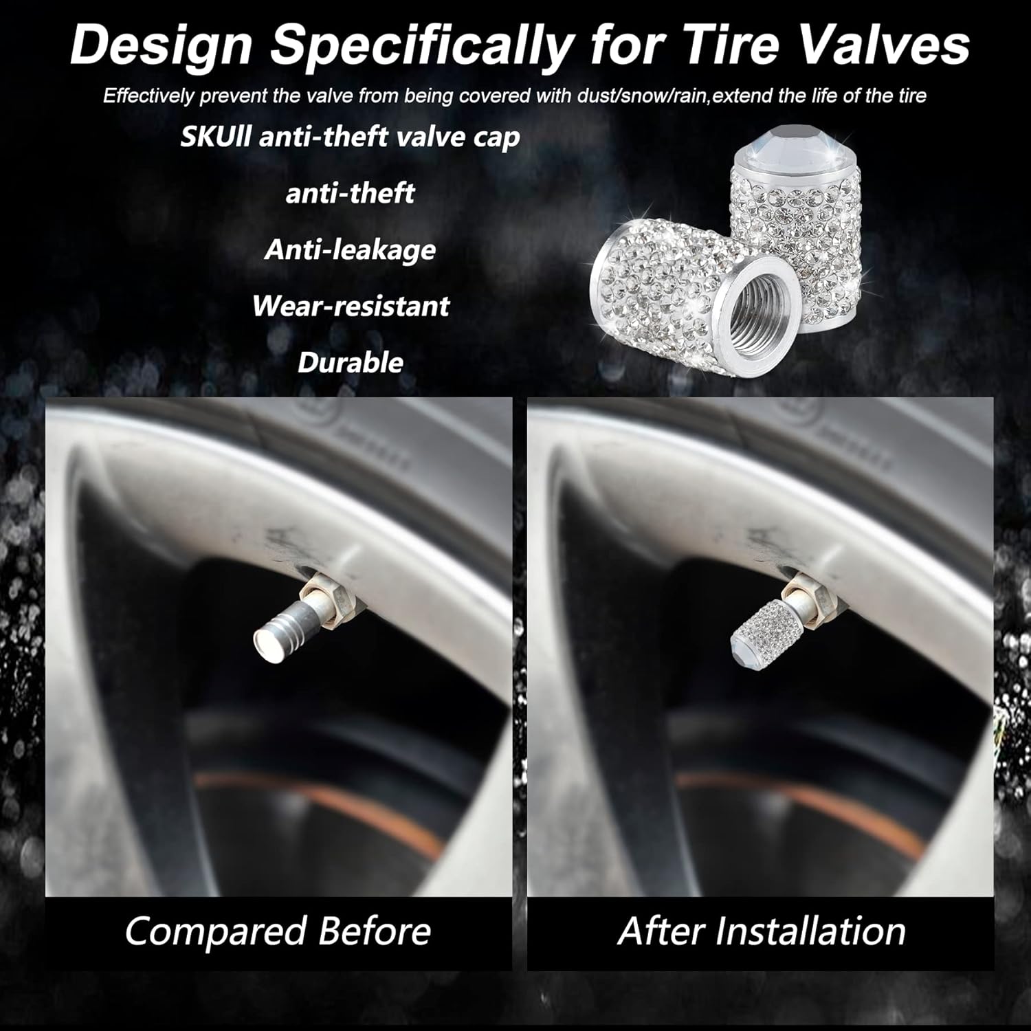 Sparkling Rhinestones Design: Our valve stem caps designed with Sparkling Rhinestones material, give your car a unique LUXURY look, also a nice gift for your families and friends.