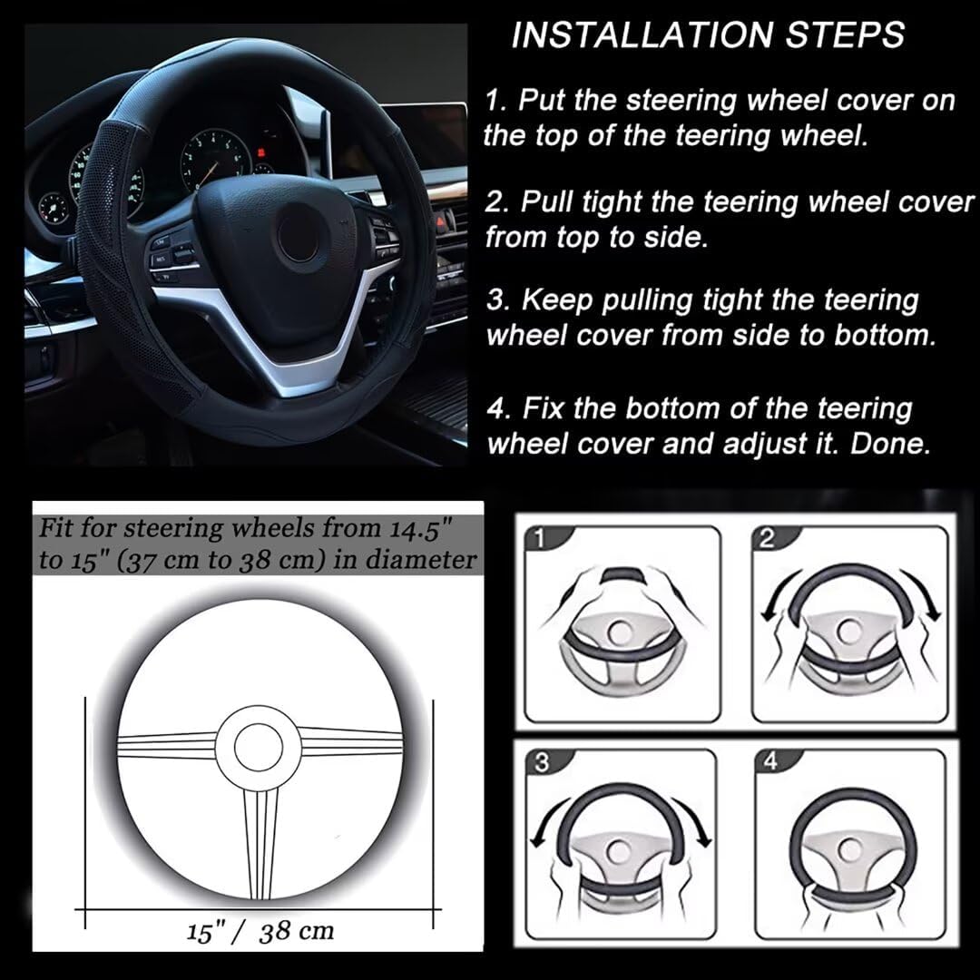 UNIVERSAL SIZE: Suitable for middle size steering wheels from 14.5″ to 15″ (37 cm to 38 cm) in diameter. Universal size fits for most VEHICLES, SUVS, VANS, TRUCKS. Easy slip on installation