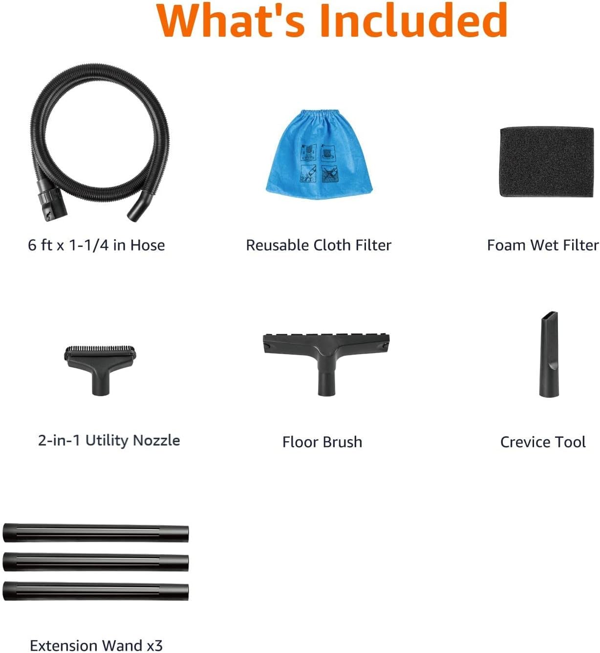 VERSATILE ACCESSORIES: This wet and dry vacuum cleaner includes a reusable cloth filter, foam wet filter, and locking hose, plus multiple nozzles and extension wands for diverse cleaning tasks