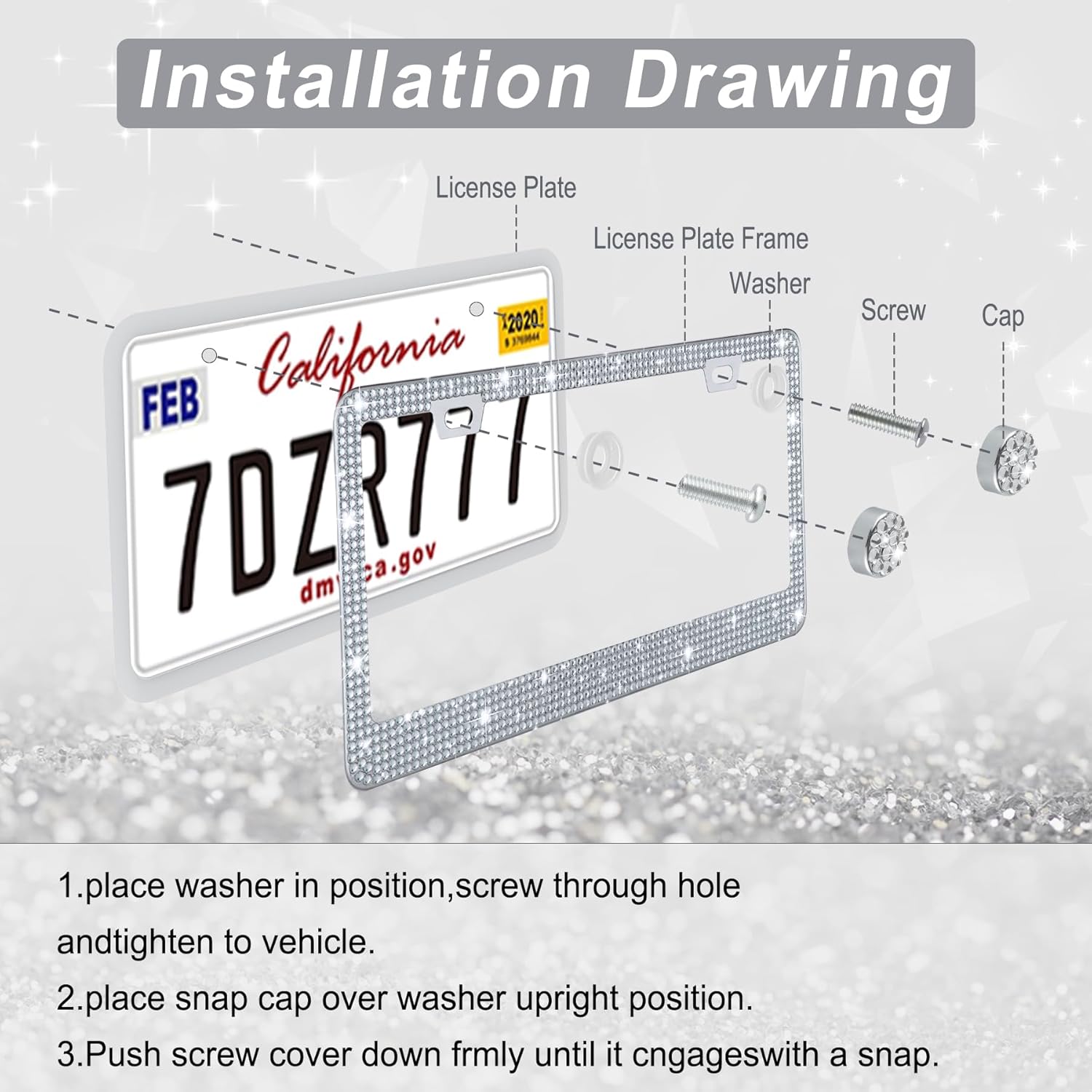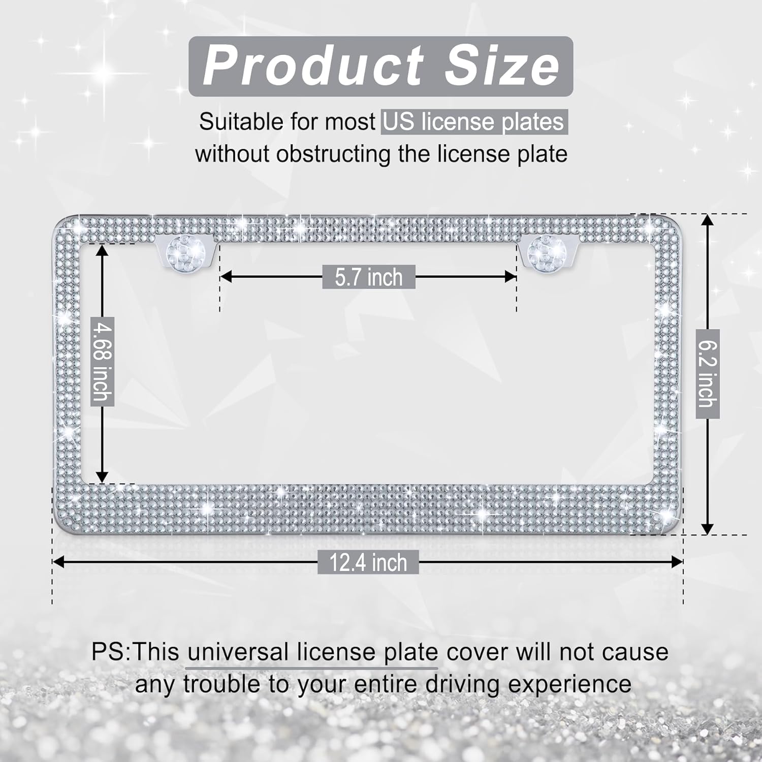 PREMIUM QUALITY: It is difficult to slip off after prolonged usage due to the stainless steel material, polygon-cut crystal rhinestones, wear-resistant, waterproof, and completely covered with exquisite handcrafted crystal. In addition, the expertly polished license plate frame won’t harm your hands or your automobile.