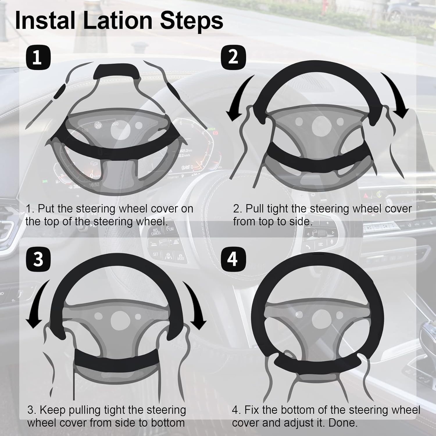 Easy to Install: Installation of this car wheel cover is a breeze too. Just place the cover on top of the steering wheel. Press and hold the upper part of the cover and gradually lower it with both hands on either side to tighten.