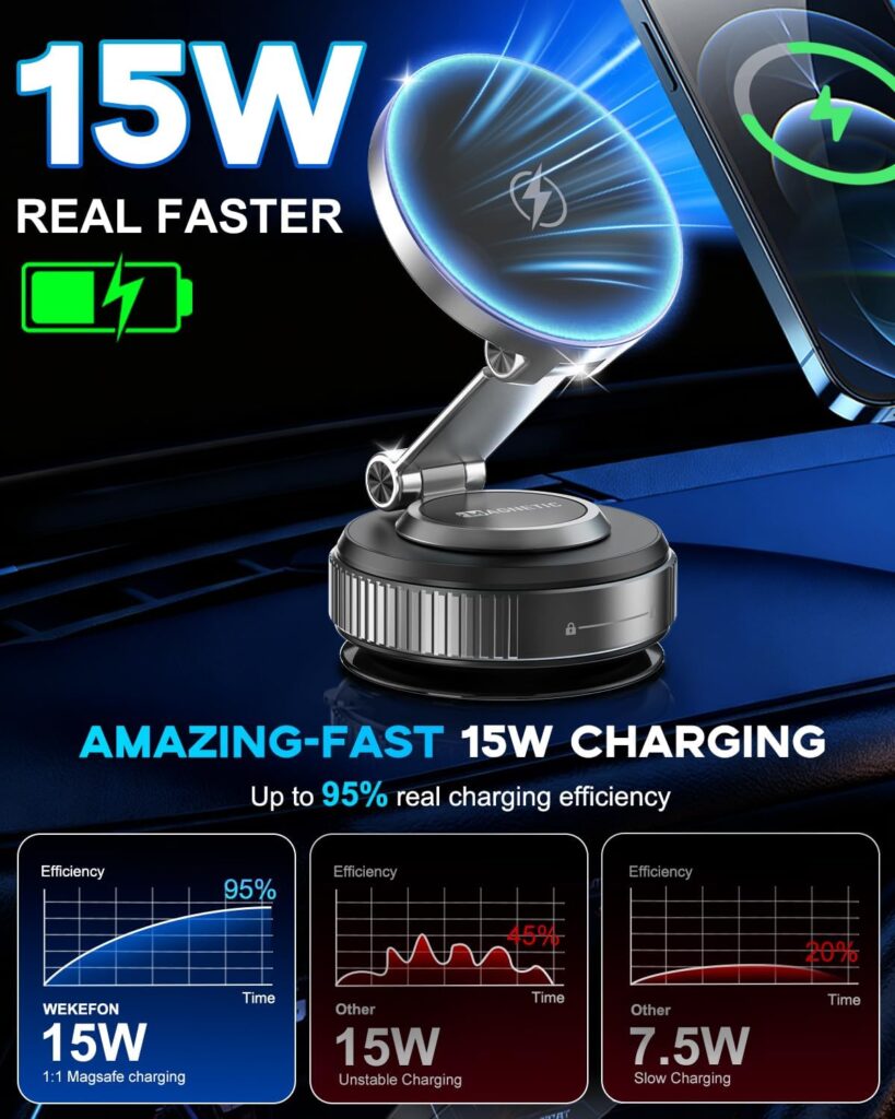 This car phone holder is an absolute game-changer. After trying countless other mounts that were either flimsy or just wouldn’t stick, this one is a breath of fresh air. The build quality is top-notch, and the design is sleek and unobtrusive, which I love. It blends in perfectly with my car’s interior without being a big, bulky distraction.The magnetic hold is seriously impressive. My iPhone 16 Pro Max snaps into place instantly and stays put no matter what. I’ve driven on rough, bumpy backroads, and my phone hasn’t budged an inch. This is a huge relief, especially when using GPS. The suction cup is equally solid—I’ve had it mounted on my dashboard for weeks now, and it hasn’t lost its grip, even in a heatwave. It’s a rock-solid, reliable mount that I can trust.Pros:* Exceptional Suction Strength: The suction cup holds onto the dashboard or windshield with a “death grip” that doesn’t falter, even on textured surfaces or in hot weather.* Powerful Magnetic Hold: The MagSafe connection is incredibly strong, securing even large phones like the iPhone 16 Pro Max and Samsung GS-25 Ultra without any slipping or rattling.* Versatile and Adjustable: The 360-degree swivel and adjustable arm allow for perfect phone positioning, whether you need it for navigation, hands-free calls, or facial unlocking.* Premium Quality & Design: It feels well-built and sturdy, with a sleek, minimalist carbon fiber design that looks great in any car.* Easy to Use: The installation is quick and simple, and the MagSafe feature makes mounting and removing your phone effortless.Cons:* Dash Material Issues: A few users noted that the suction cup can struggle on very soft, leathery, or textured dashboards without the included extra adhesive pad.* Short Arm for Large Phones: Some users with very large phones, like the Samsung S23 Ultra, found that the arm was a bit too short for vertical mounting.* Adhesive Failure in Extreme Heat: One user reported that the suction cup adhesive failed on a very hot day when the mount was angled away from its base, suggesting it may have limitations in extreme heat with certain configurations.Suggestions for Improvement:* Offer an option with a slightly longer adjustable arm to better accommodate larger phones in various orientations.* Include clearer instructions on which dashboards might require the extra adhesive pad to ensure a secure, long-lasting hold from the start.* Consider a small tweak to the design to better handle the strain of a heavy phone angled away from the base in extremely hot conditions.