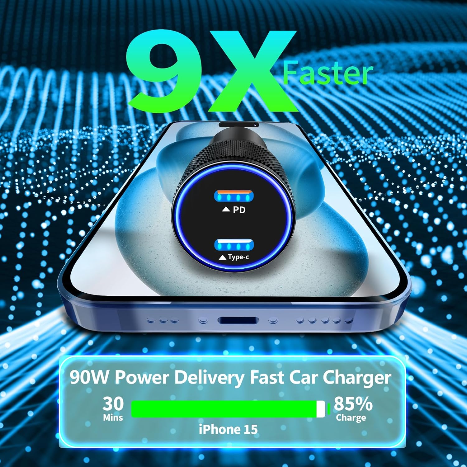 【Built-in Intelligent Power Management Chip】: This 90W Dual USB-C Port car charger Built In Smart-IC Chip can auto-detect iPhone 17 connected in each port while also identifying the appropriate current to charge your device and make sure provides uninterrupted fast charging. Adopt integrated superconductor material which engineered for reduced resistance, boosting charging efficiency and superior temperature control ensureing safer charging and protecting your iPhone 17 battery health.