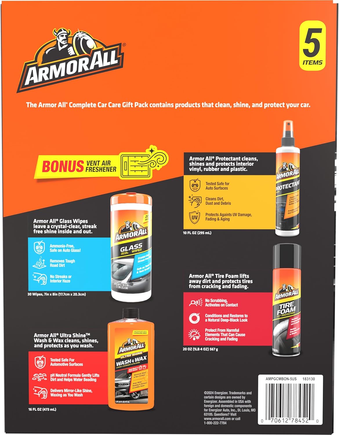The Armor All Complete Car Care Kit delivers four proven Armor All products formulated to enhance your car’s looks and protect your automotive investment. Includes Armor All Original Protectant, Armor All Ultra Shine Wash & Wax, Armor All Tire Foam Protectant and Armor All Glass Wipes. The perfect gift for the car enthusiast!