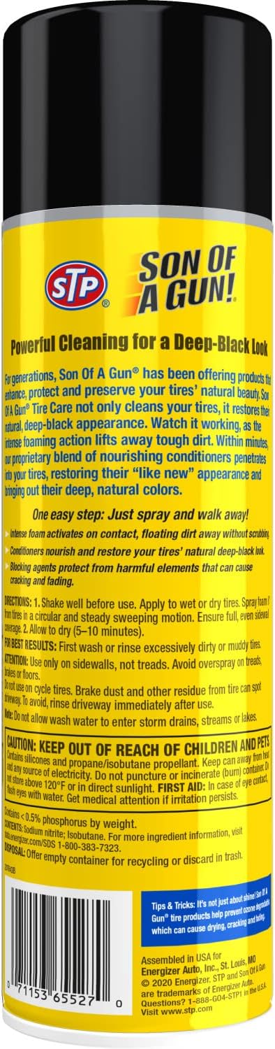 The new way to clean, shine and protect your tires with Son of a Gun One Step Tire Care. Just spray and wash. No wiping. No mess. Son of a Gun triple action foam formula: Cleans-dissolves dirt and grime. Shines-protects luster and leaves rich satin finish. Protects-penetrates and bonds to surface to protect against cracking and discoloration. For best results: Shake well before using. Spray evenly on sidewall 6 inches away in one circular motion. No wiping, no buffing, can be applied to wet or dry tires. For best results, first wash off excessive dirt. Clean extra dirty whitewalls with Son of a Gun Citrus Cleaner & Degreaser. Safe for all wheel surfaces. Contains no Chlorofluorocarbons. Do not spray on brake rotors, drums, floors, or cycle tires. Note. Excess residue from tires should be rinsed from driveways and other surfaces to avoid spotting.