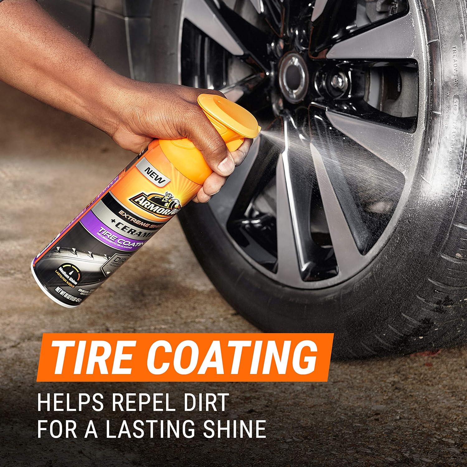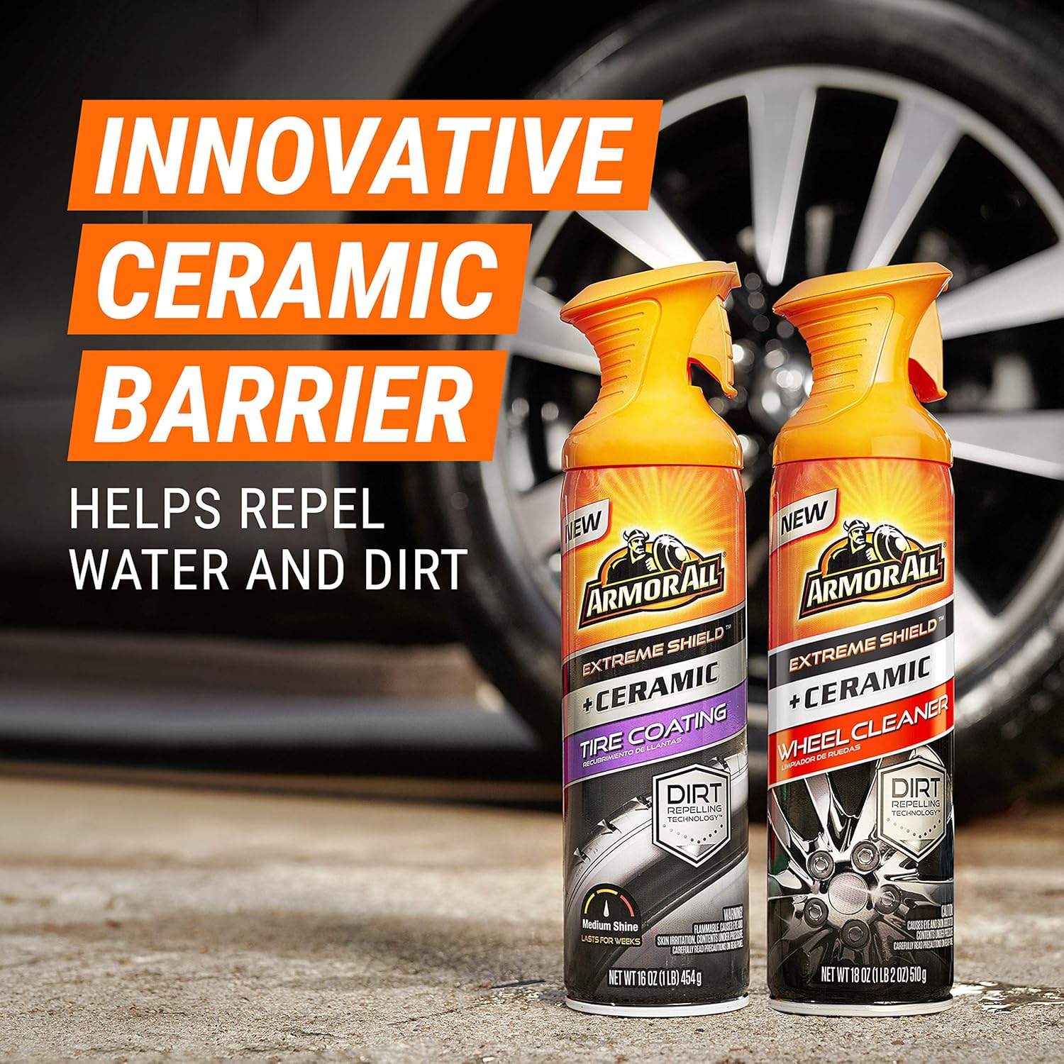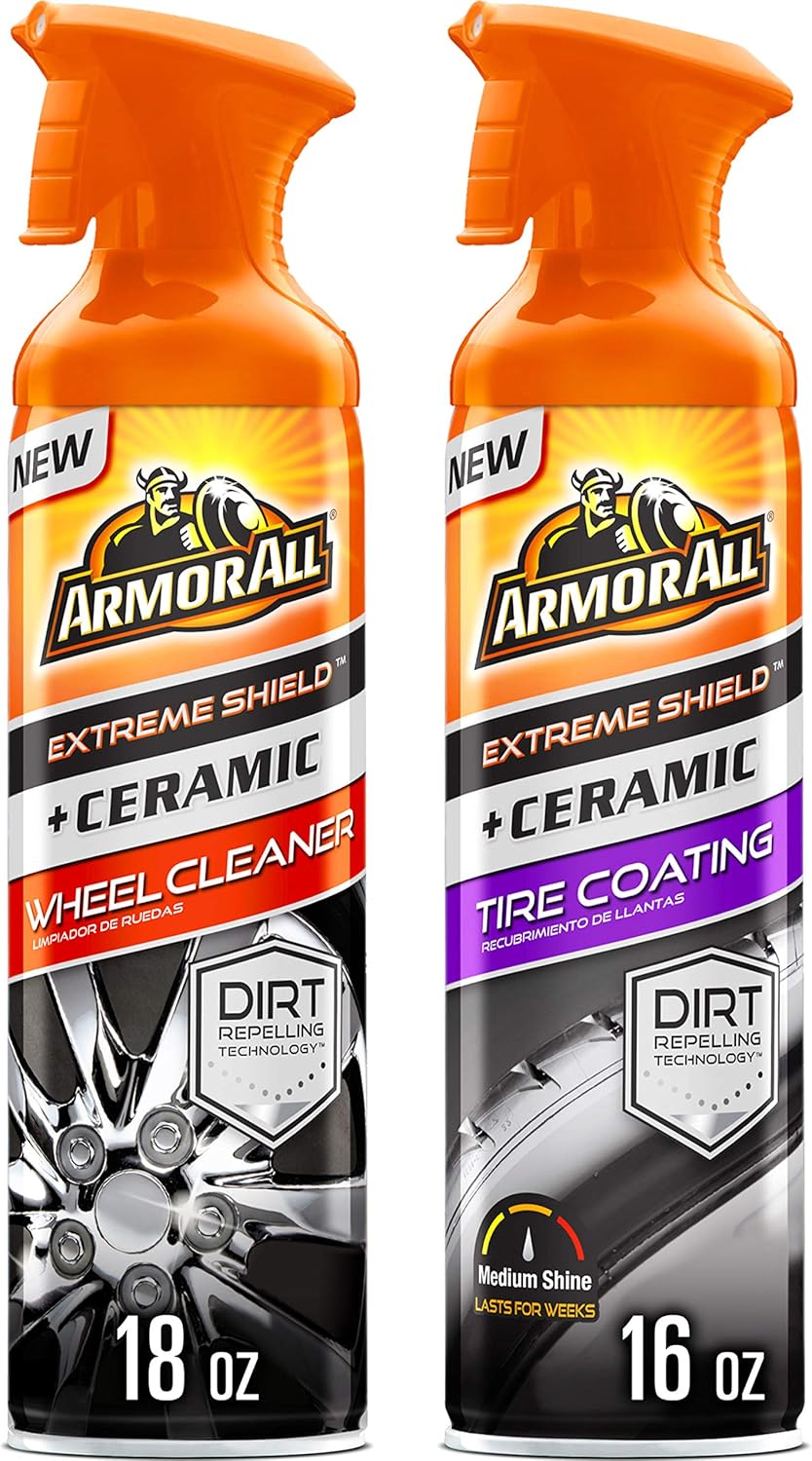 Armor All Extreme Shield + Ceramic Tire Coating dirt-repelling formula shines and protects, plus leaves behind a durable barrier using SiO2-based technology that helps tires stay clean, longer. Patent Pending Formula. Non-greasy, medium shine finish dries to the touch. Endures for weeks against rain, dirt and multiple car washes. Easy-to-use multidirectional aerosol spray with uniform coverage. Keep your wheels clean for longer with our Extreme Shield + Ceramic Wheel Cleaner. Its invisible protective barrier repels and prevents dirt & road grime from sticking to your wheel’s surface.