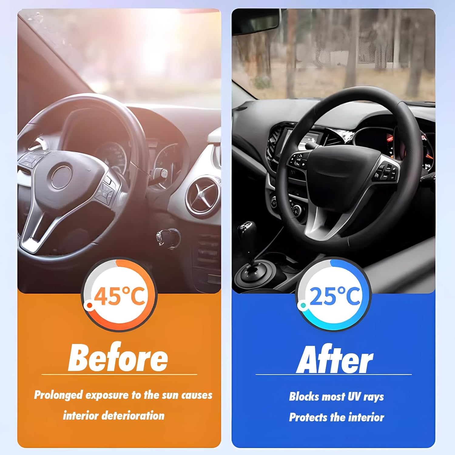 UV & Heat Blocking: Advanced reflective coating deflects harmful UVA/UVB rays and blocks heat to keep your car’s interior up to 90°F cooler.Protects the dashboard, seats and electronics from sun damage and fading.