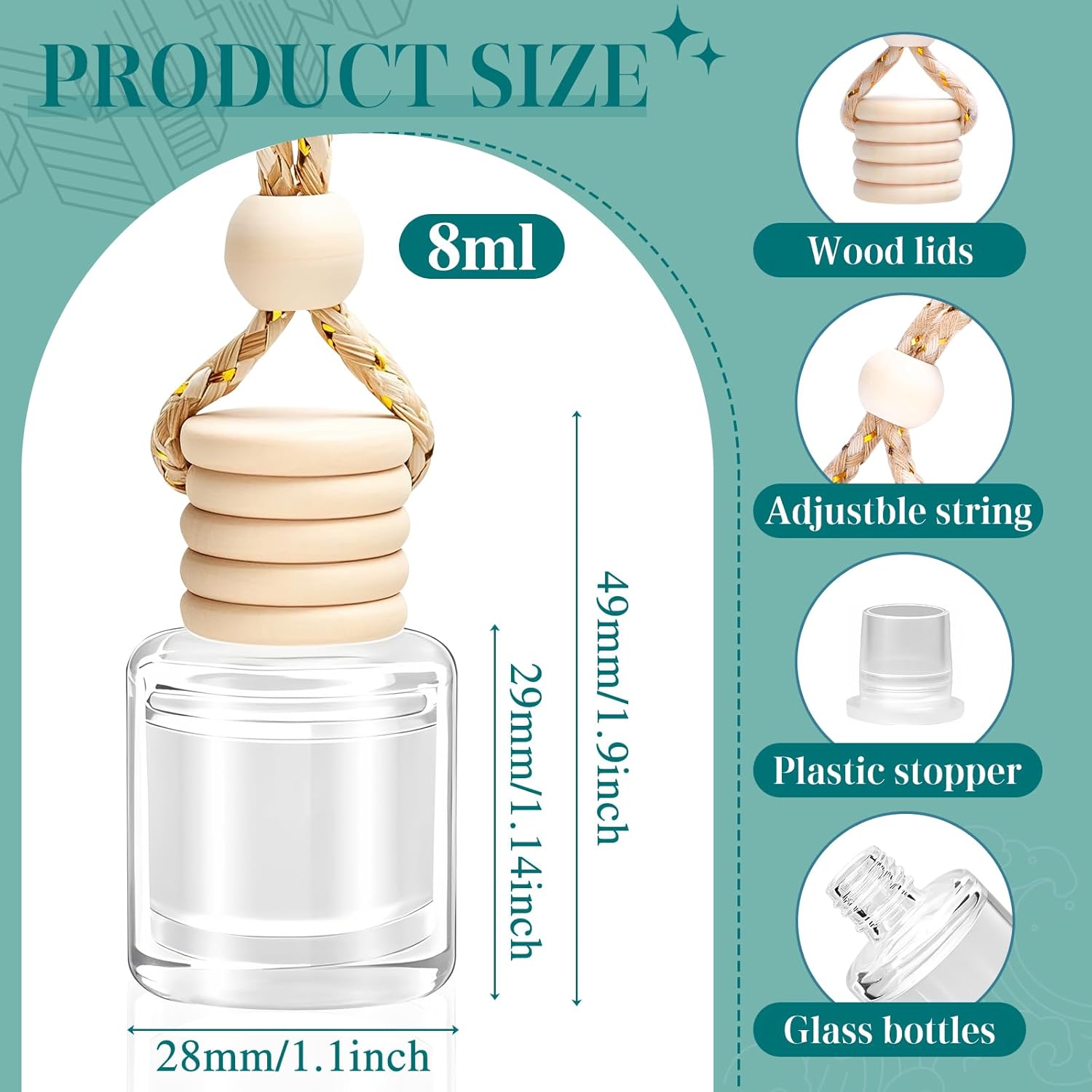 【Easy to use】:1. Unscrew the wooden lid 2.Remove the inner stopper 3.Screw wooden lid back on 4.Invert the bottle for 3-5 seconds,Hanging on the rearview mirror, start enjoying your journey