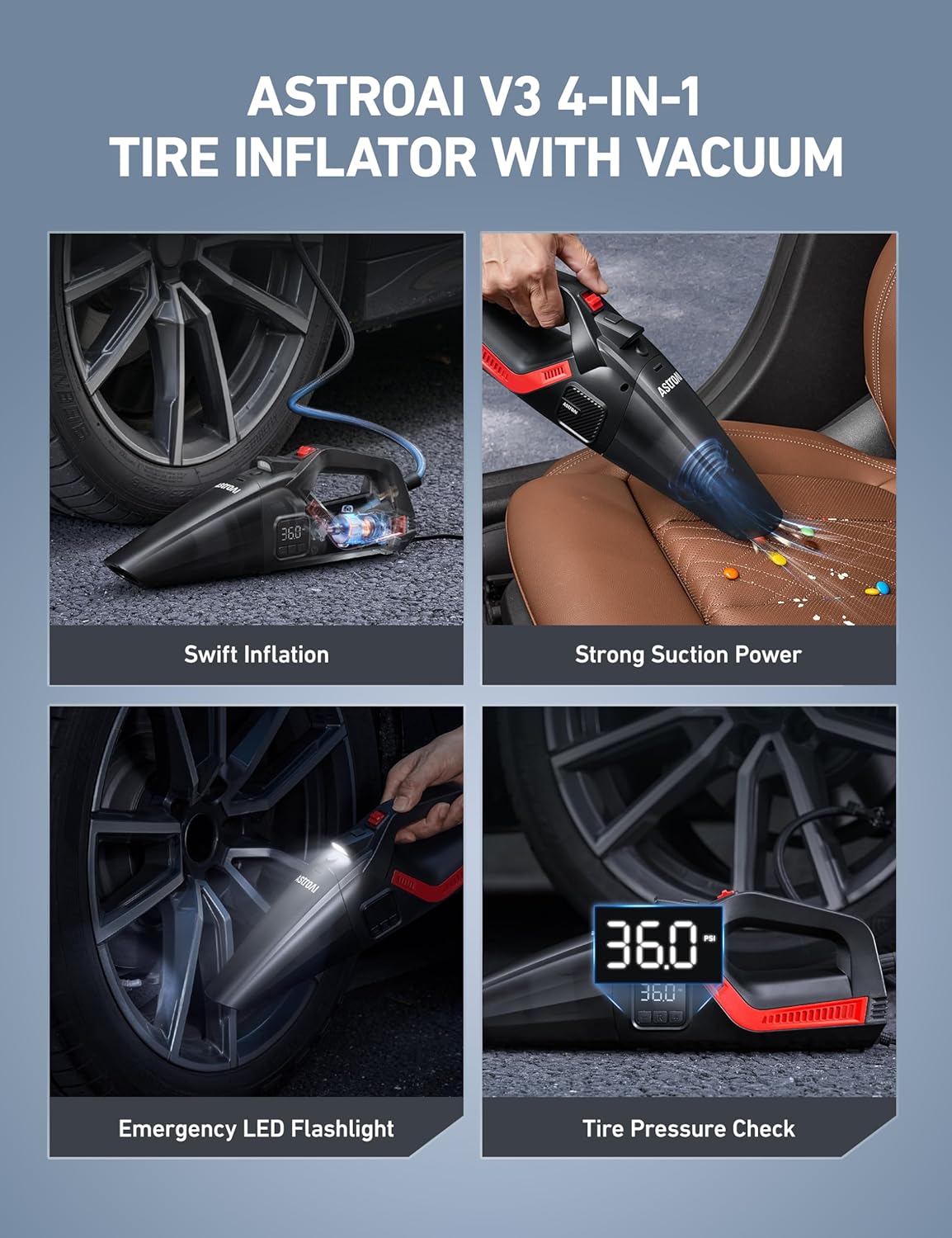 4-IN-1 TIRE INFLATOR WITH VACUUM: An ideal gifts for car guys and gifts for dad, the AstroAI V3 combines inflation, vacuuming, a smart display screen, and LED lighting in one powerful tool. Use Setting I for vacuuming and Setting II for inflating tires up to 25 inches. It also effortlessly removes dust, residue, and pet hair from your car. The smart display keeps readings clear, and the built-in LED light makes night use simple and safe. The V3 is one tool for all your needs. Note: This device is only suitable for inflating tires up to 25 inches and is not designed for large vehicles like trucks, RVs, or SUVs.