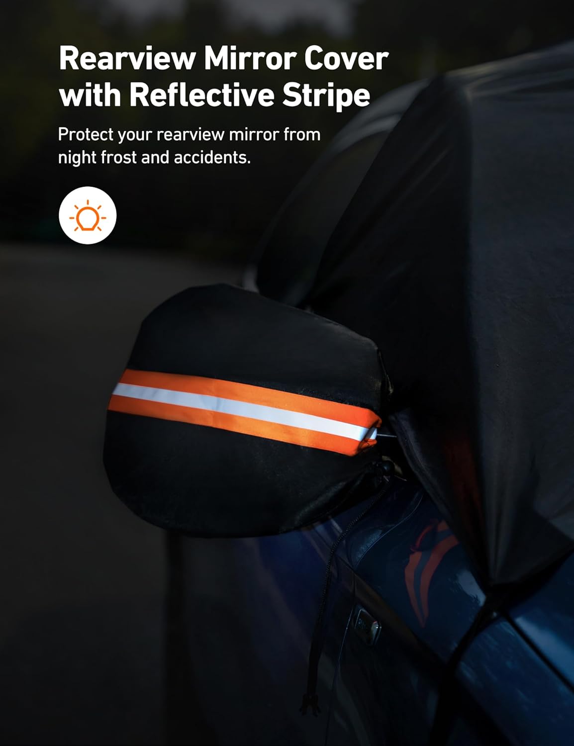 Safety Design: We added the anti-theft buckle to prevent the Car Snow Cover from being stolen, and also prevent the rain from entering the car. The covers of the rear mirrors are equipped with a safety reflective strip which can prevent accidents at night