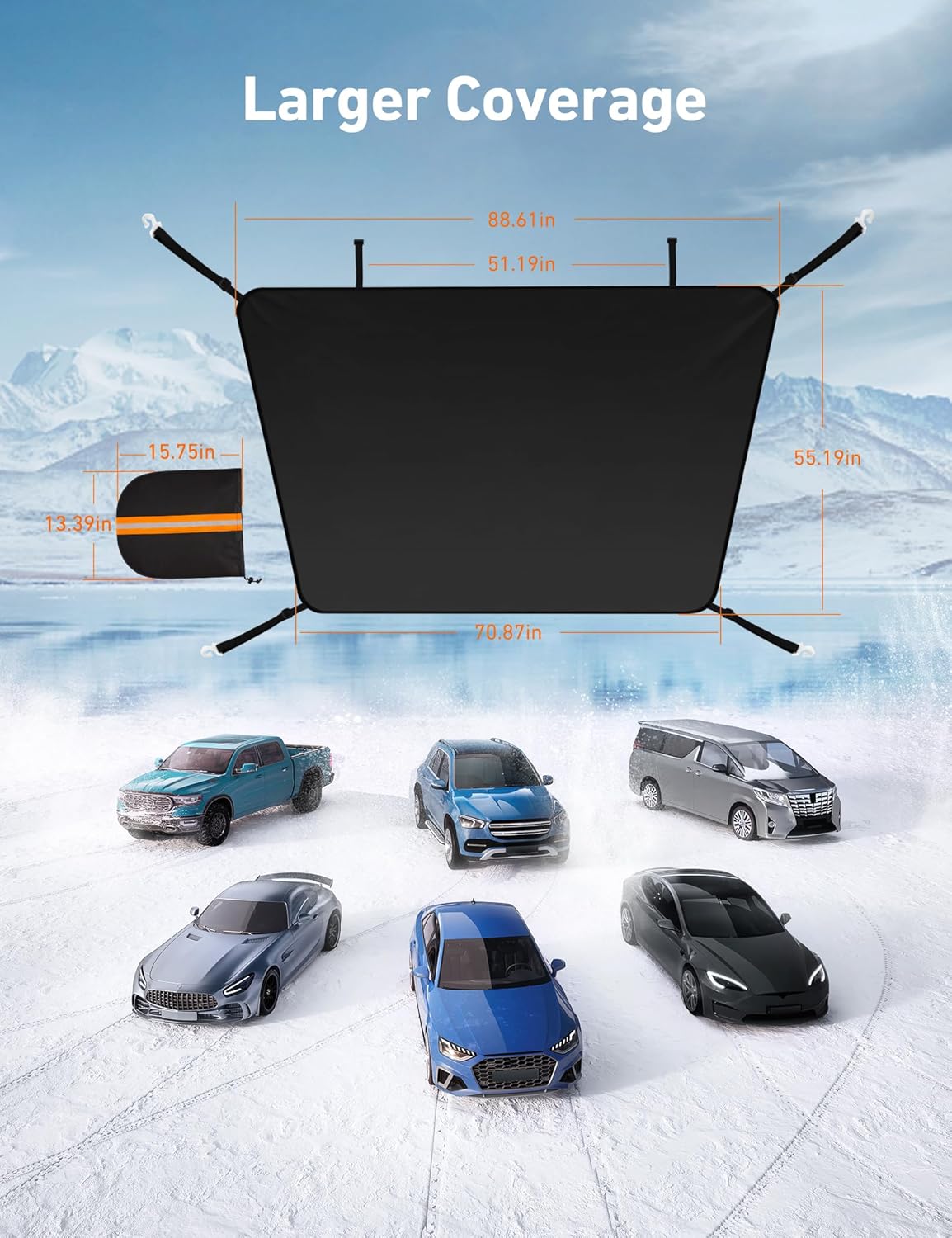 More Windproof Design: Four fixing straps with hooks helps the snow cover stays firmly, the cover will not be blown away. The fixing straps are elastic and rugged, you can adjust their length to fit the car