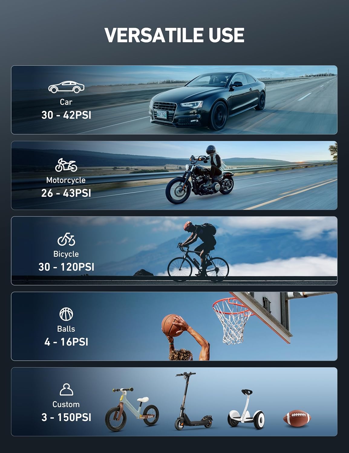 EASY TO USE: You can choose 4+N smart modes (car, motorcycle, bicycle, ball, and custom) and 4 pressure units as needed (PSI, Bar, kPa, kg/cm²) to preset based on your various inflation needs.The custom mode allows you to freely preset the desired pressure value (3-150PSI) based on the inflatables you want to inflate. Suitable for outdoor activities, road trips, and as a car lovers gift for men who have everything.