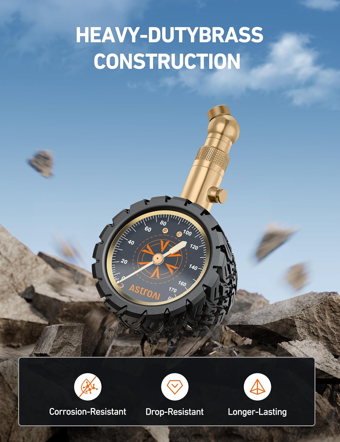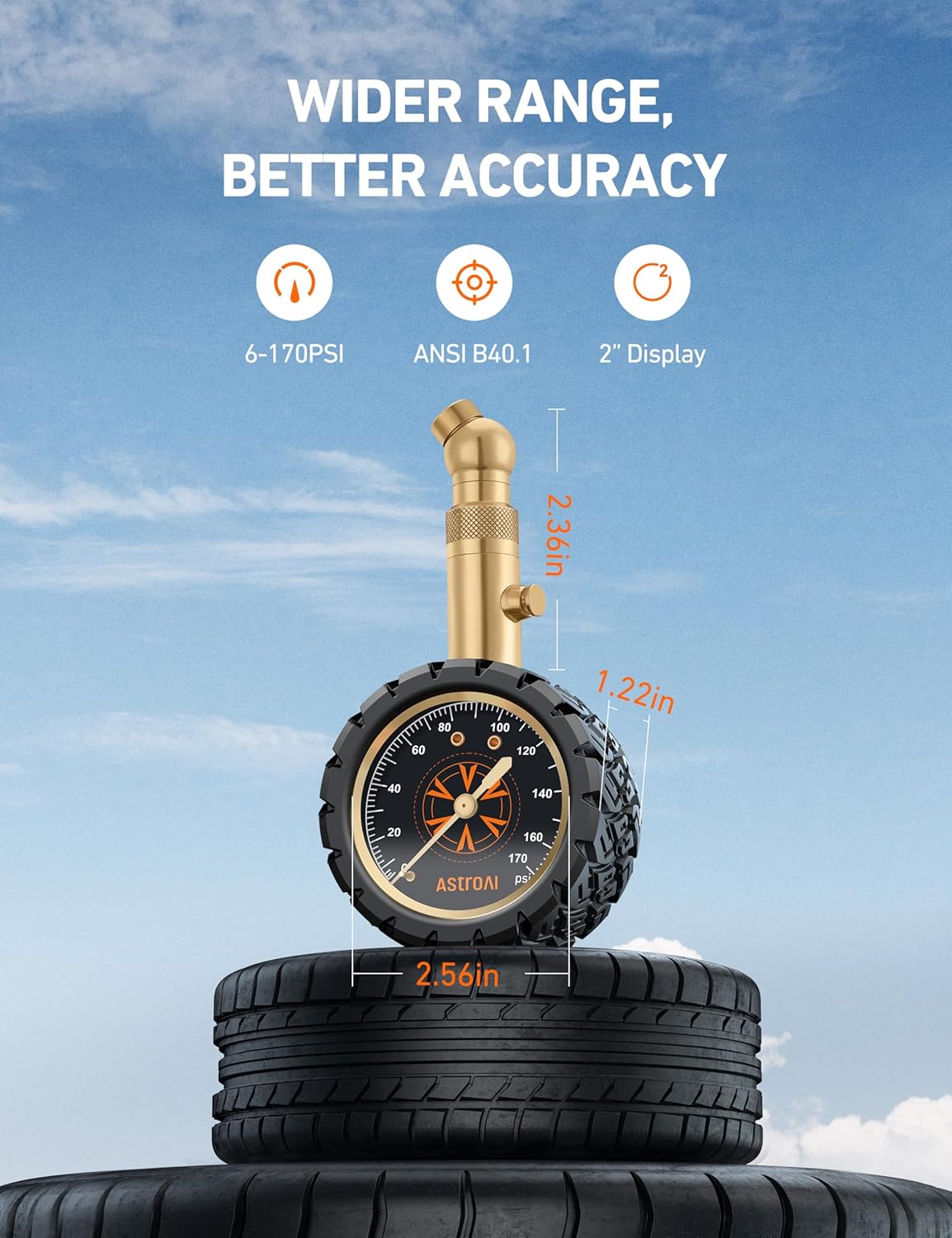 High Accuracy: The AstroAI Tire Pressure Gauge accurately measures from 6-170 PSI. With certified ANSI B40.1(1%) accuracy and professional calibration, it always returns precise tire pressure readings, eliminating guesswork with a large 2″ glow dial.