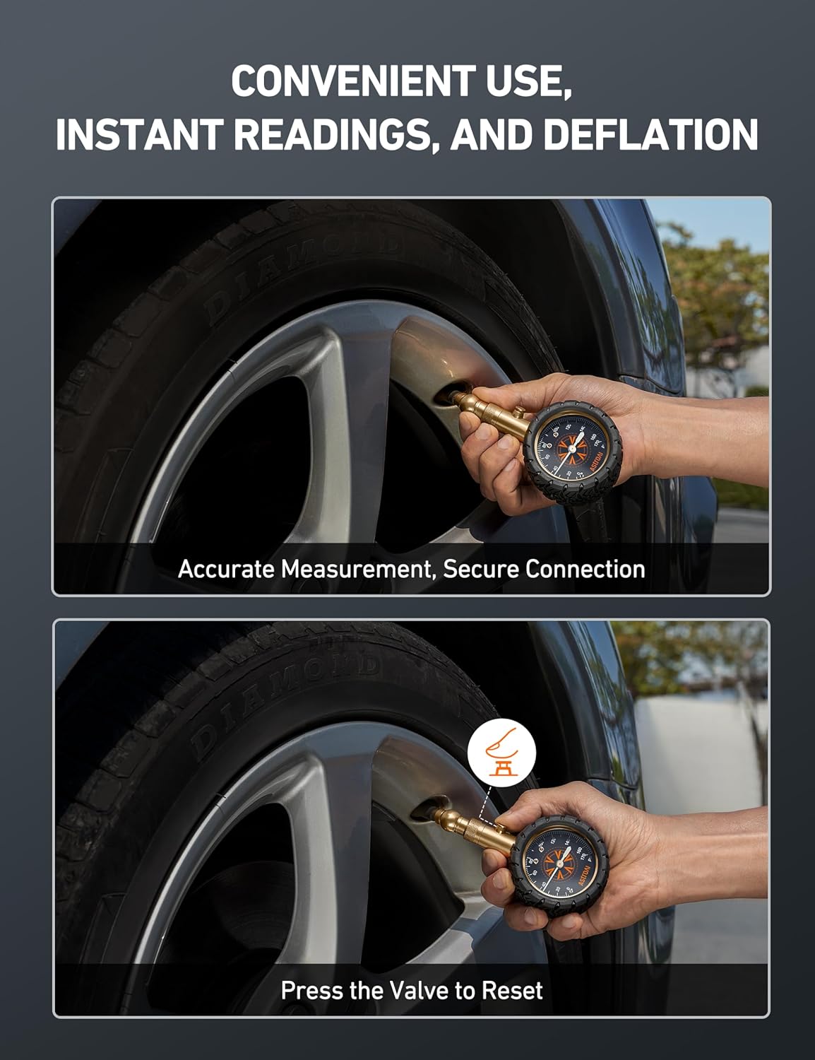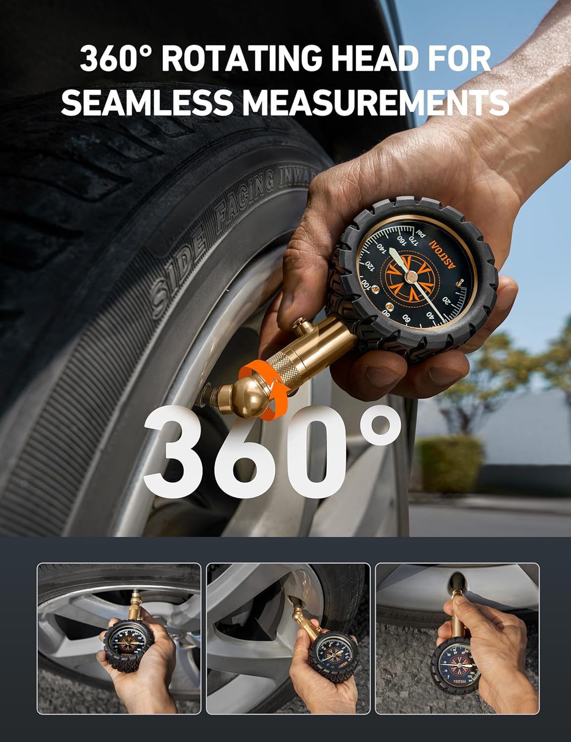 Air Leakage Prevention: The 360-degree swivel chuck and durable rubber hose are flexible enough to form a tight seal with tire valve stems, ensuring no air leakage. This gauge easily reaches awkward valves on cars, trucks, and motorcycles.
