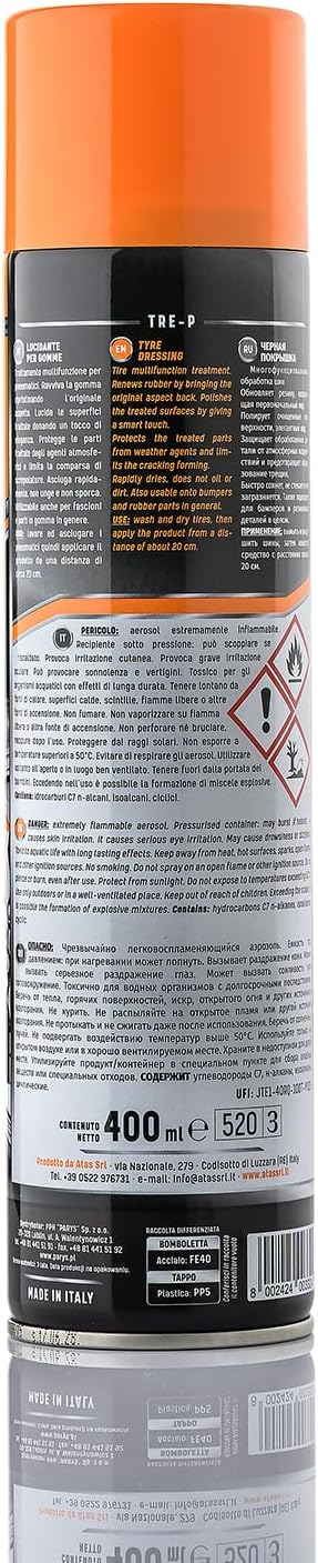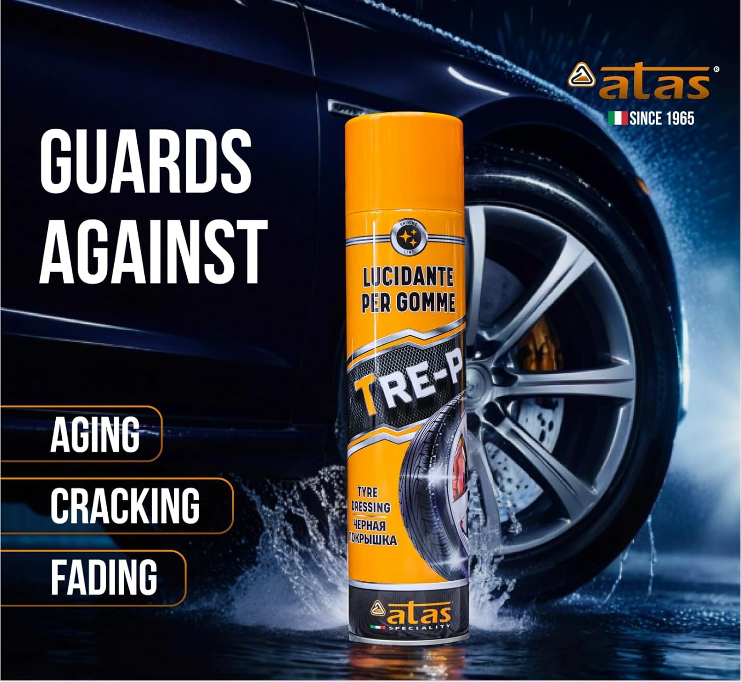 ATAS Italian Tire Shine Spray – Long-Lasting Shine, Deep Black Gloss, Professional Tire Dressing, 13.5 fl oz,3-in-1 Revive, Protect & Polish Cleaner