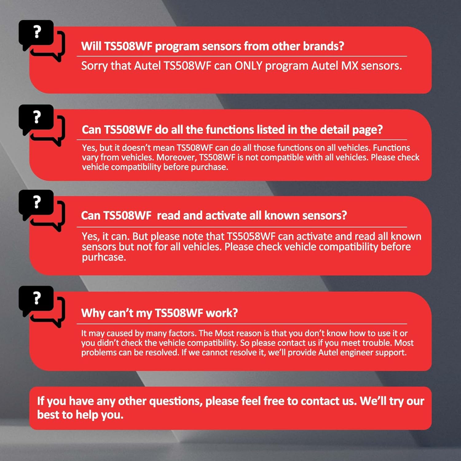 [SEAMLESS SENSOR PROGRAMMING] Effortlessly program Autel MX-Sensors (315MHz & 433MHz) to replace faulty units. Choose from two fast programming methods: Auto Create or Copy By OBDII, ensuring a perfect match when you need to program new TPMS sensors in seconds. NOTE:TS508WF TPMS programming tool is designed exclusively to program Autel MX series sensors. Please check vehicle compatibility below.