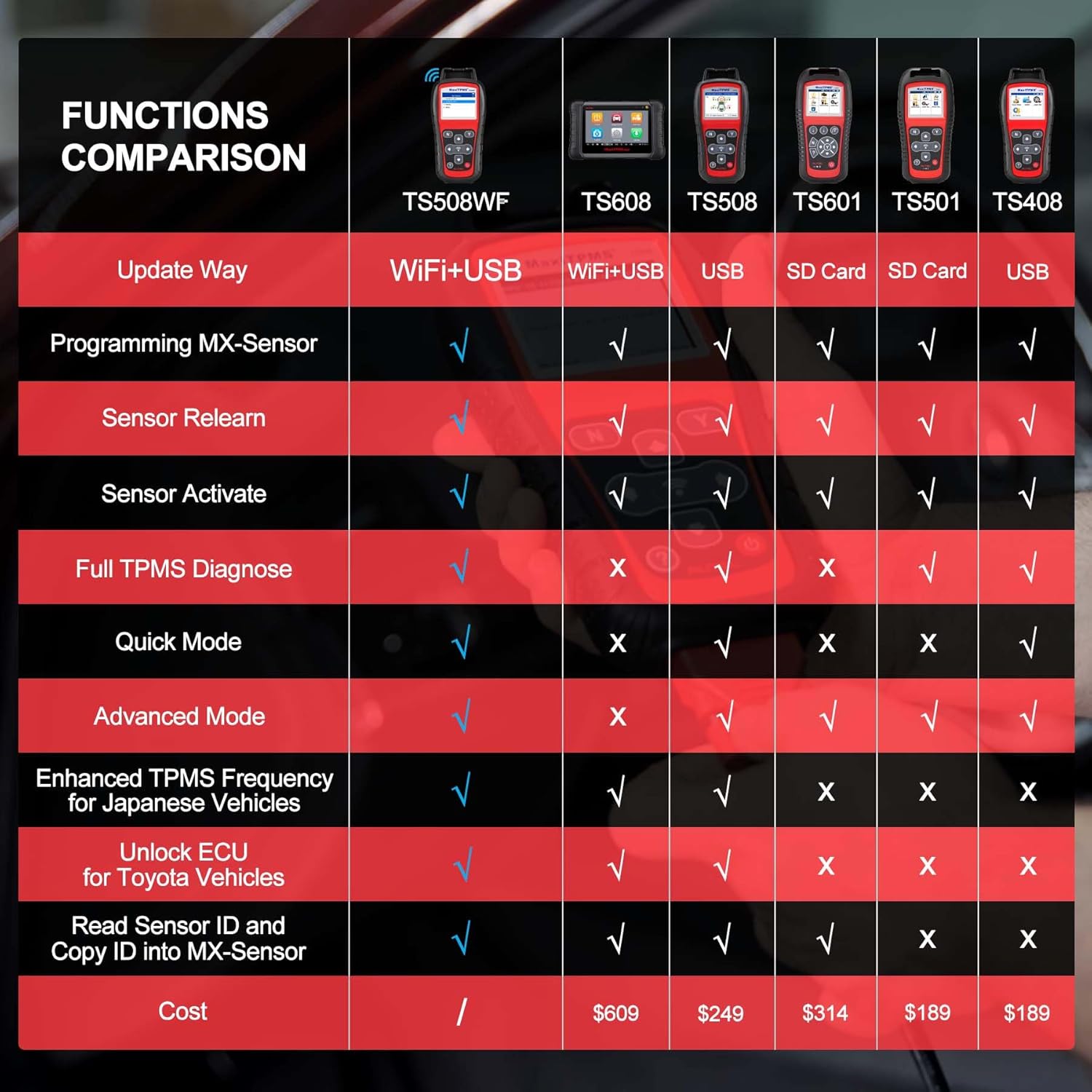 [STAY CURRENT WITH FREE WIFI UPDATES] Never Outdated – Vehicle technology evolves, and so does this tool. The TS508WF connects to WiFi for free lifetime software updates, ensuring you have the latest vehicle coverage and features to fix TPMS fault codes on new models. Use our enhanced A+ Content guide below to check compatibility for your specific make and model.