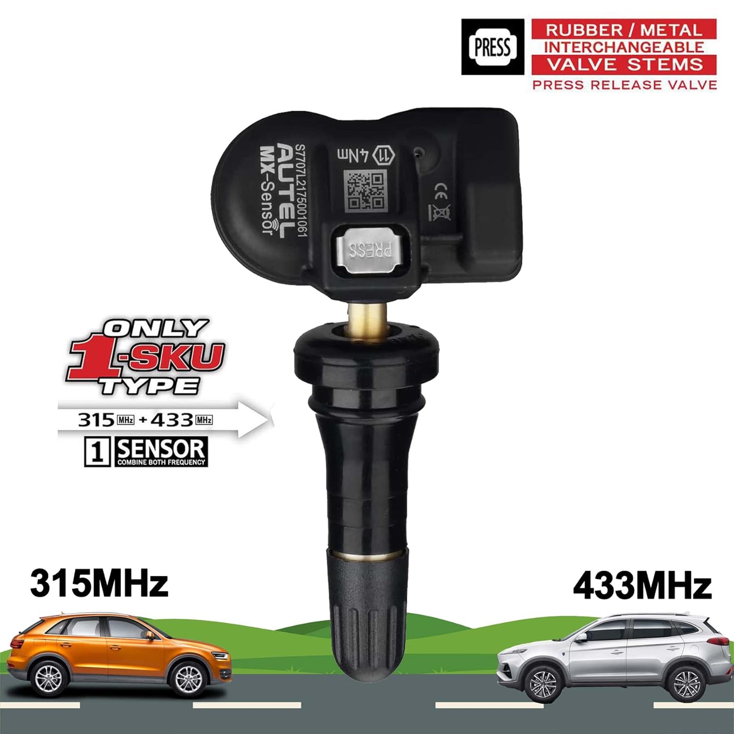 [2 in 1 Dual Frequency, Easy to Install&Replace] Autel TPMS sensors combine both 315MHz + 433MHz frequencies into one TPMS sensor with the highest industry vehicle coverage. Press-in designed rubber/metal MX-Sensors can be quickly replaced without difficulty, to greatly minimize installation time and accurately match with the vehicle tires. NOTE: Autel MX-Sensors can only be programmed by Autel Tool.