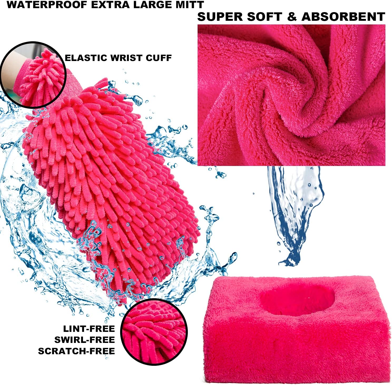PREMIUM MATERIAL: The car cleaning tools are made of soft material that is lint-free, scratch-free and swirl-free. Absoulately safe to clean on delicate surfaces. Gentle on paint while tough on grime or dirt. Waterproof roomy wash mitt helps protect your hand all the way and reduce the damage to your skin. Kit size: 11.8”x9”x4”