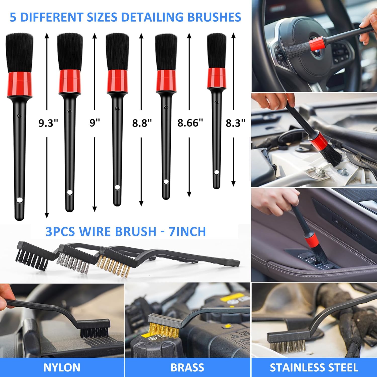 Car Detailing Kit: Disposable crevice cleaning brushes thoroughly clean your car’s tight crevices and come with 10 replacement heads for added convenience with no cleaning required after use. The large interior brush features a non-slip streamlined design that’s perfect for cleaning your car’s interior, and the complete tyre cleaning kit helps to clean tyres and wheels quickly. 5 detailing brushes and other kind of brushes, meet all you need of car detailing or cleaning