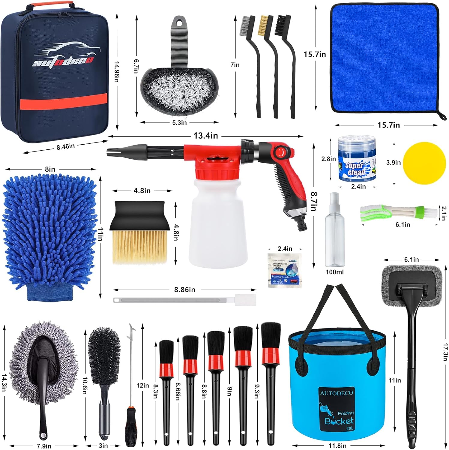 1 low-pressure foam gun with twist nozzles, quick coupling and leaking-proof tape, long handle mop, 2 In 1 windshield brush, 1 bucket, 1 windshield cleaning tool, 1 spray bottle, 1 grit trap, 10 disposable crevice brushes, 1 interior brush, 1 wash sponge, 1 tire brush, 1 hub brush, 5 detailing brushes, 3 wire brushes, 1 wash mitt, 2 towels, 2 wax applicator pads, 1 air conditioner brush, 1 stone clearing hook, 1 duster, 1 bag