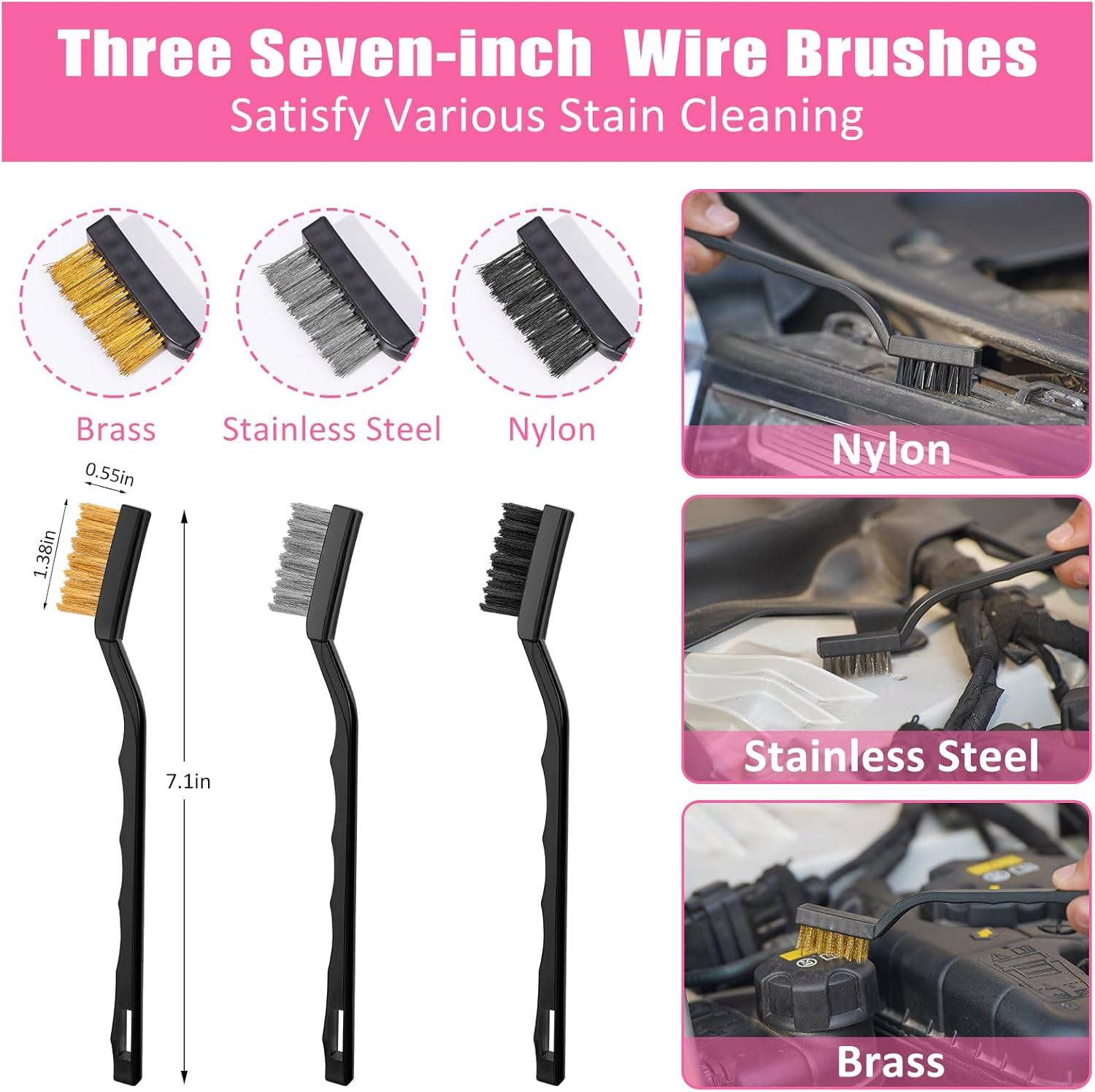 17Pcs Car Cleaning Kit Interior: This kit has everything you need to deep clean your car’s interior, with 17 essential tools included. 1 windshield cleaning tool and 100 ml spray bottle, 2 replaceable microfiber pads, 5 detailing brushes, 3 wire brushes, 1 duster, 2 microfiber towels, 1 car interior brush, 1 durable tool storage bag