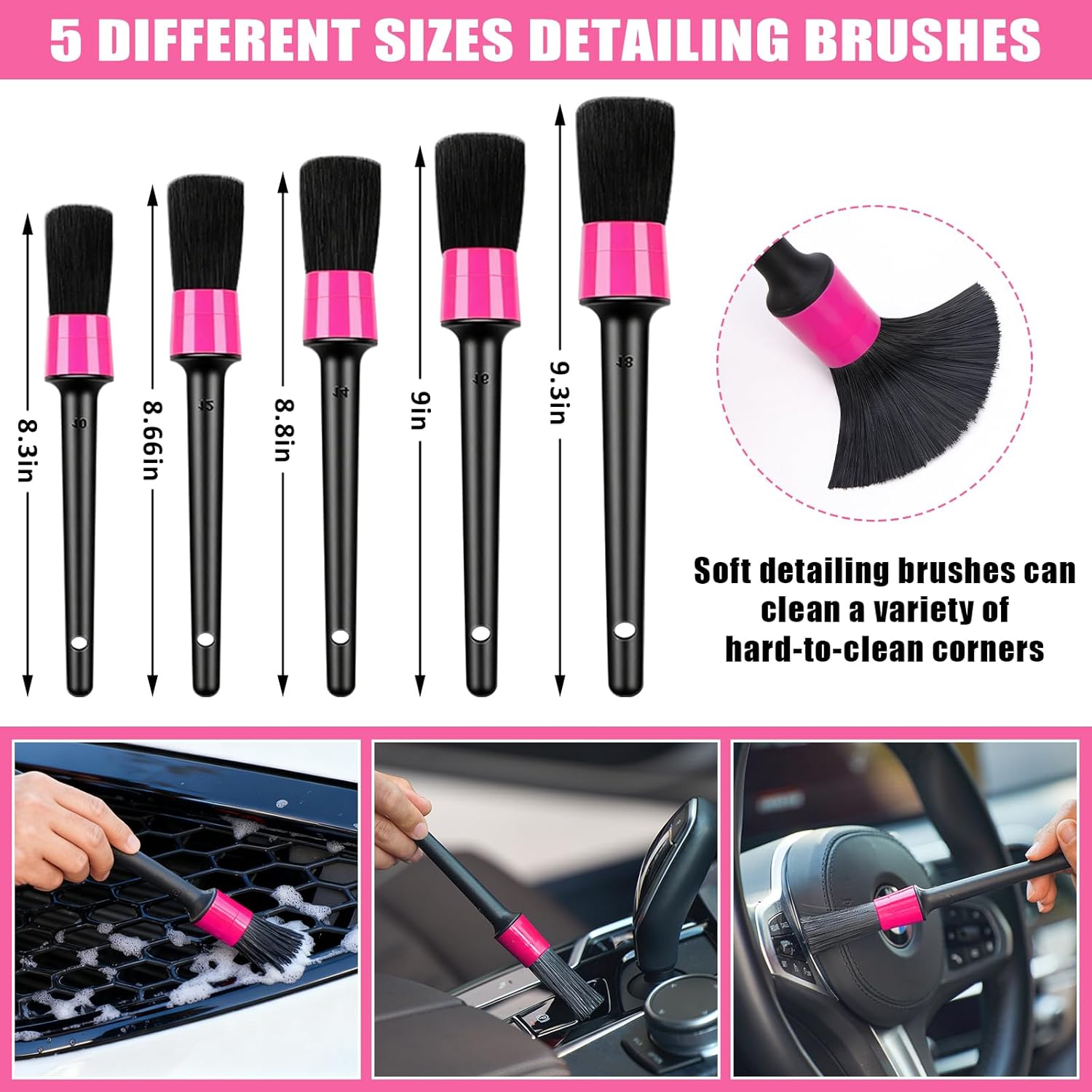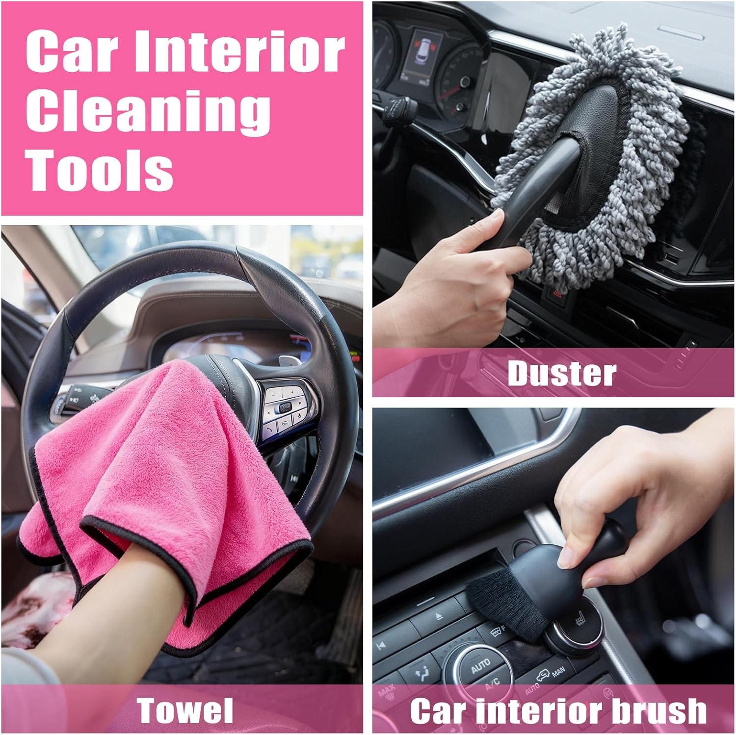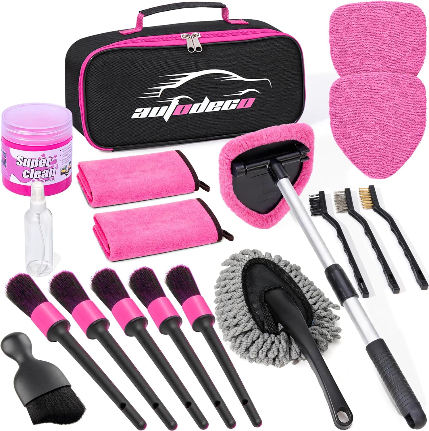 AUTODECO Windshield Cleaner Tool, 17Pcs Car Interior Detailing Kit, Detailing Brush, Towels, Duster, Car Cleaning Kit Interior for RVs, Truck, Trailer (Pink)