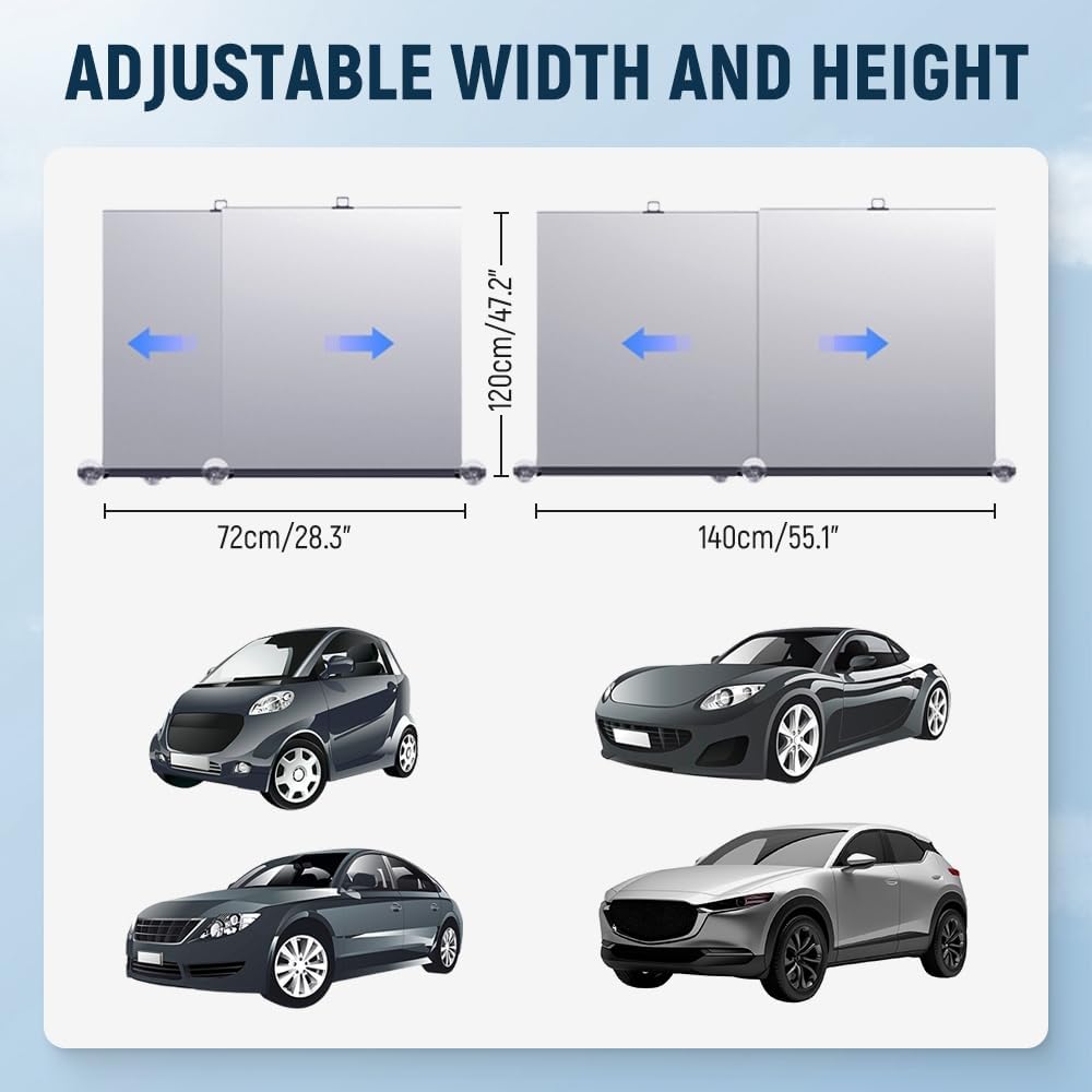 ✨【Adjustable Coverage for All Models】This sunshade’s customizable dimensions—40.5″ height and 29.1-59.1″ width—make it suitable for various vehicles, including sedans, SUVs, and MPVs. Its discreet placement at the windshield’s base ensures safety while offering effective sun heat insulation.