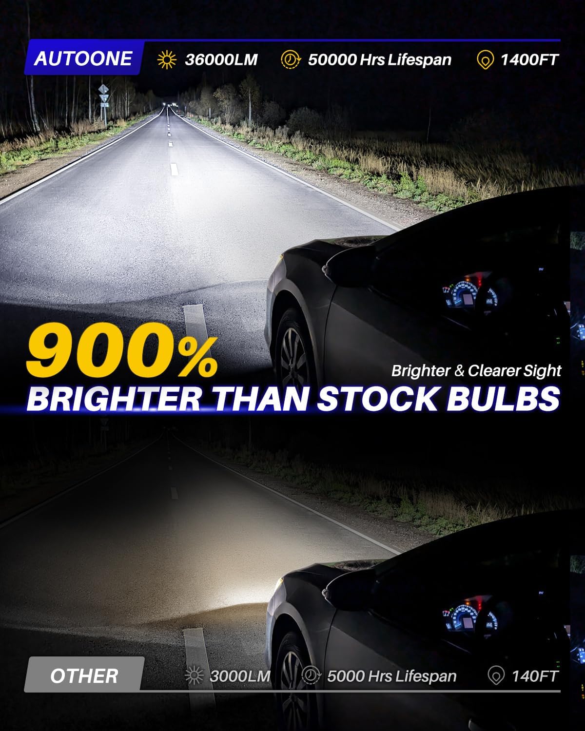 – Experience brilliance with up to 36,000 lumens—900% brighter than conventional 9004 hb1 bulbs—allowing you to see farther and wider, ensuring safer night driving.
