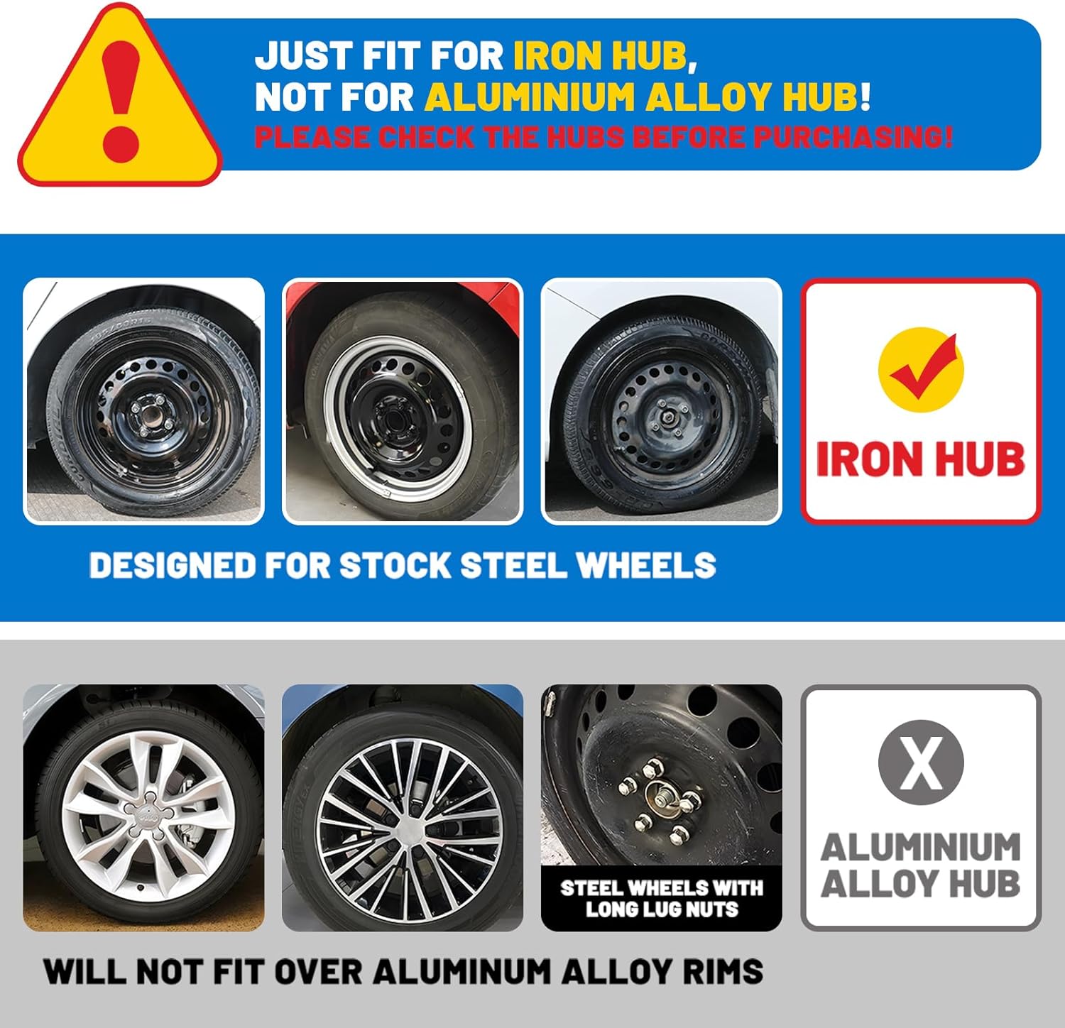 UNIVERSAL FIT – Designed for 15″ iron wheels, does not apply to aluminum wheels and wheels that are too high in the center. Please check carefully before purchasing!