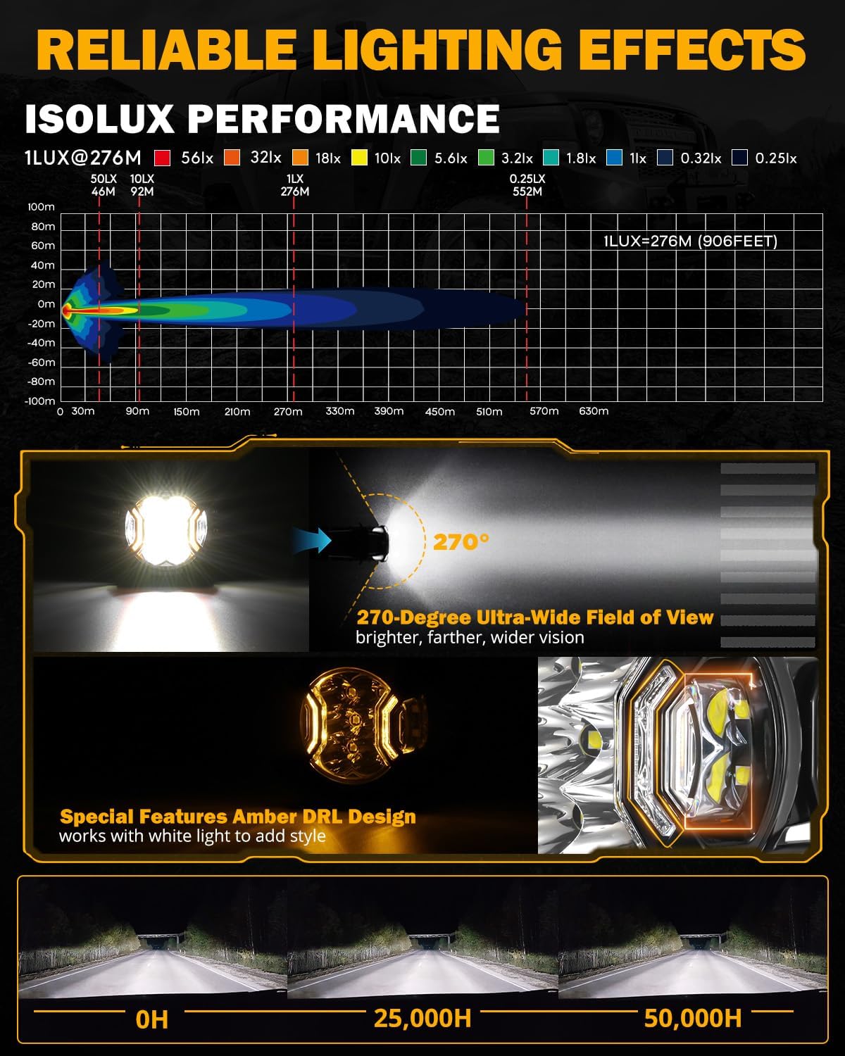 【SUPERIOR DRIVING VISION】Moving beyond traditional LED lamps that only offer front lighting, we’ve innovatively added a double side light design to our product. Combined with the hyper spot light beam, it provides a comprehensive 270-degree light coverage, ensuring clearer, wider, and further visibility.
