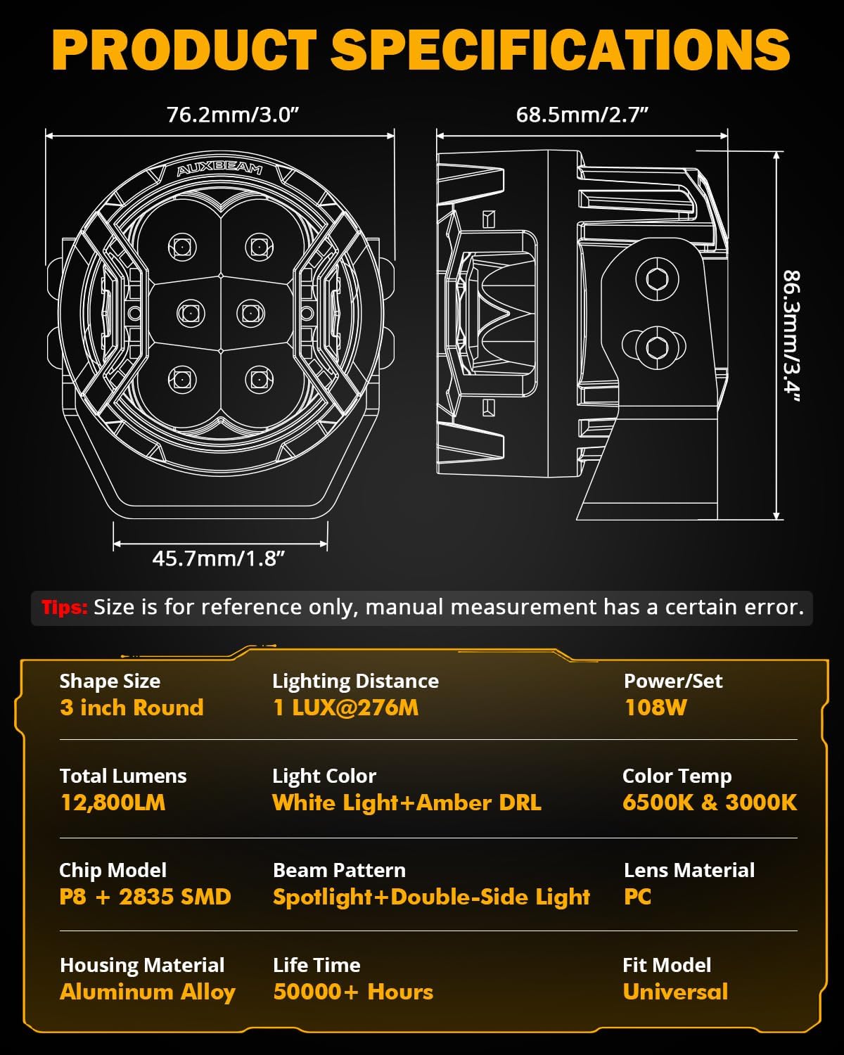 Auxbeam 3 Inch Round Driving Lights, 108W Side Shooter Offroad Pod Lights with Amber DRL, 270° Ultra-Wide Ditch Light Hyper Spot Beam Work 3 Modes White Amber Yellow Cube Pod with Covers, Pair