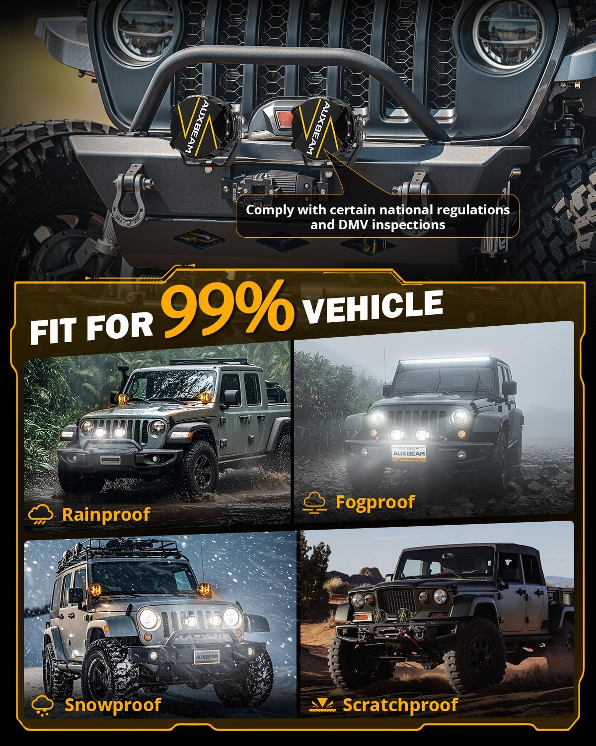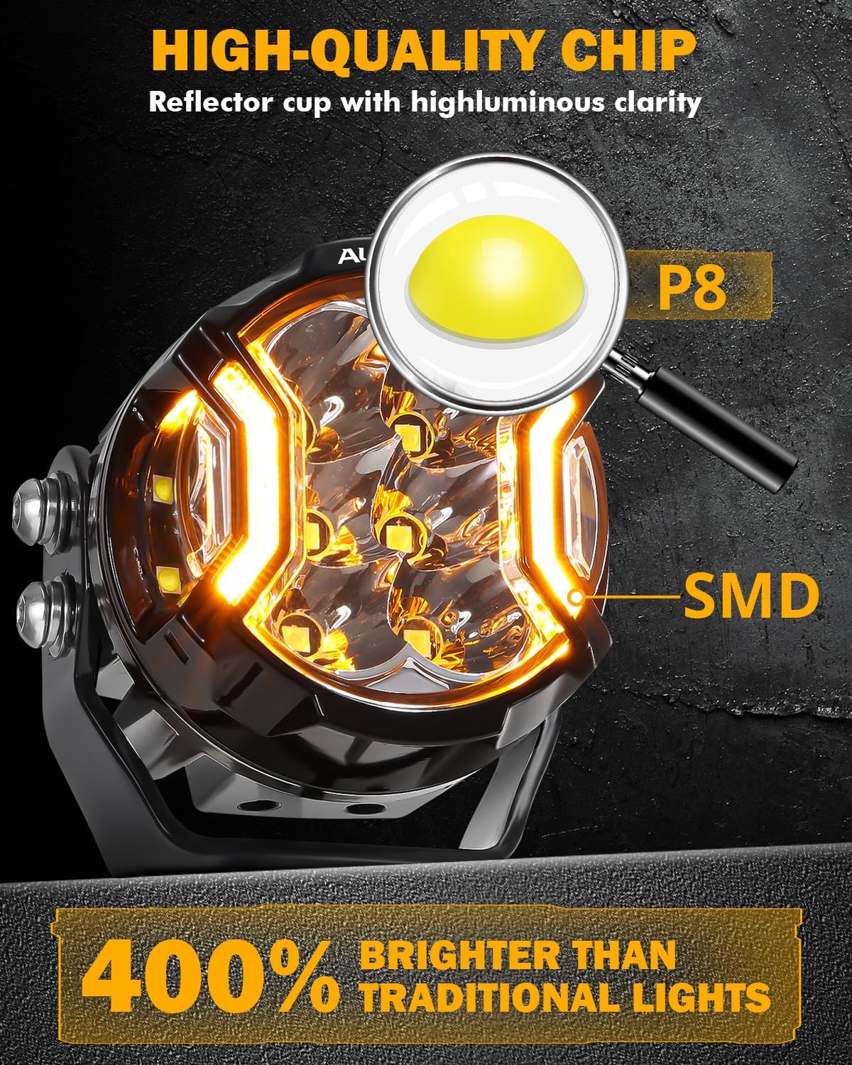 【MULTIFUNCTIONAL & COST-EFFECTIVE】The LED driving lights provide 3 different lighting modes, you can choose different ambient lighting, including Yellow Main Light, Amber DRL or Turn Signal. We also provide two black protective covers. Not only do they enhance your vehicle’s style and off-road appeal, but they also ensure compliance with state regulations and DMV inspections, keeping your lights road-legal.