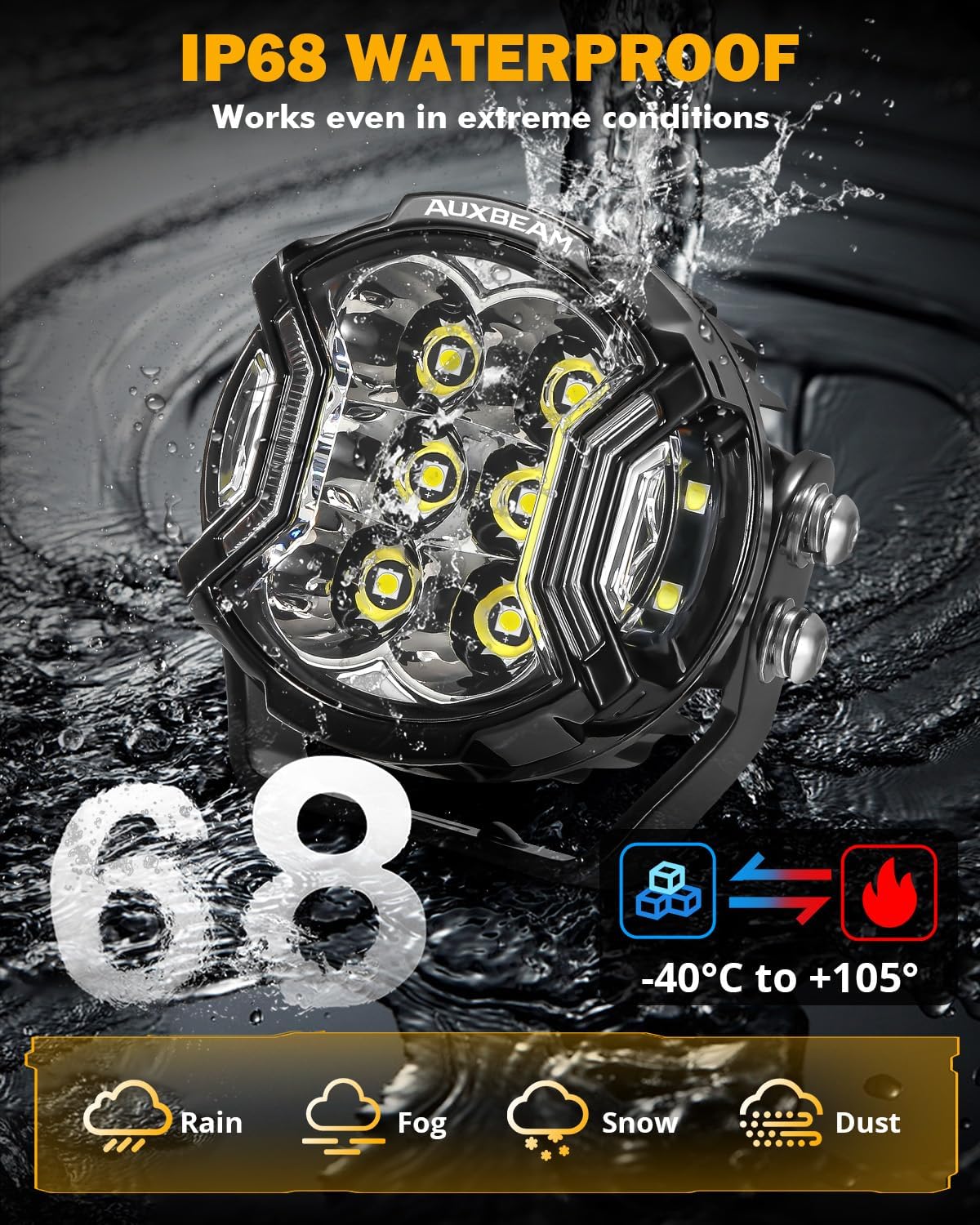 【IP68 TRIPLE WATERPROOF SOLUTION】We’ve continuously improved our waterproof system based on user feedback. Our LED driving light, with its 100% sealed design, can withstand submersion and harsh conditions without damage from rain, fog, moisture, or dust. Trust in our rigorous quality inspection for a product that truly lasts.