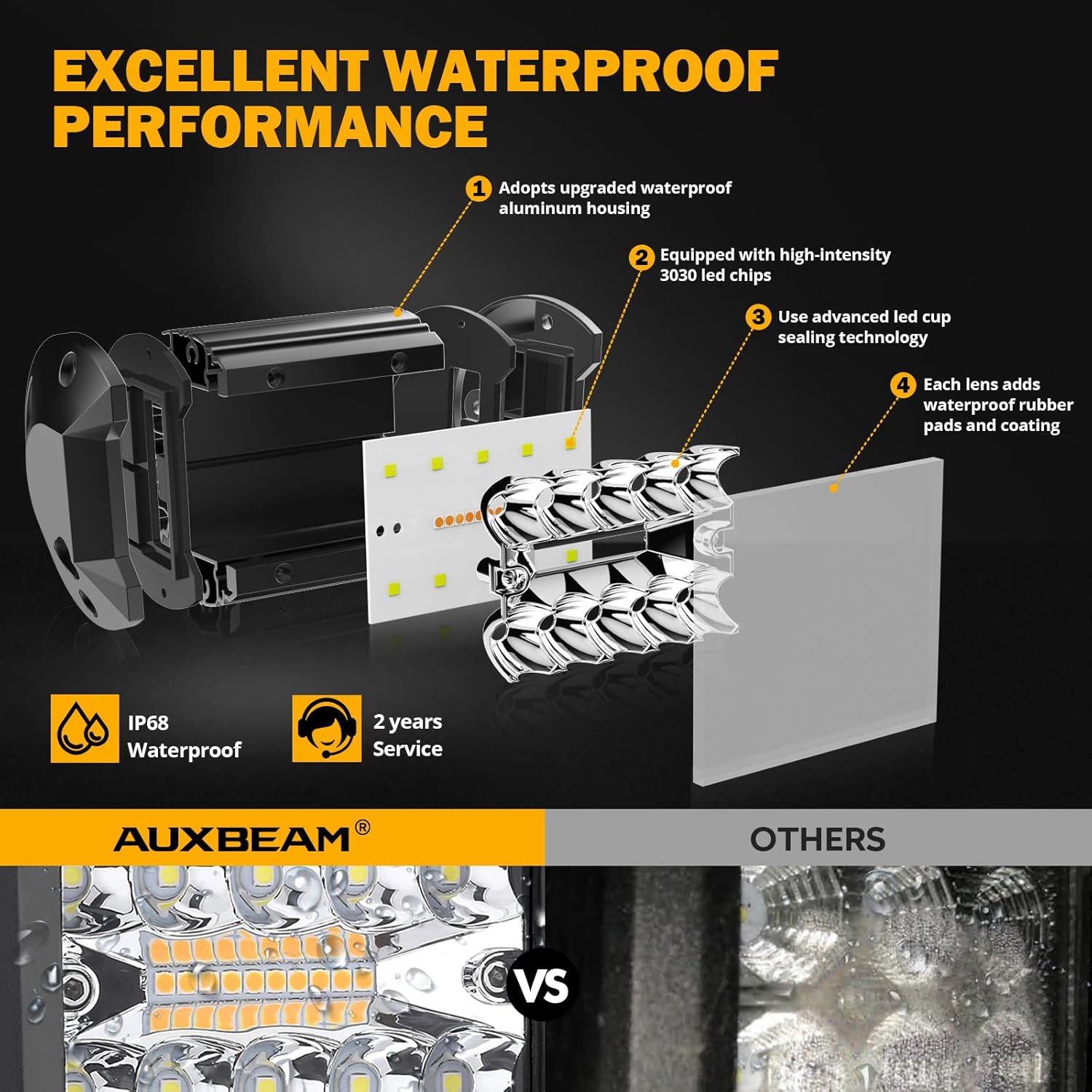Super Brightness – 4 Inch led pod light bar with high intensity LED chips, super cool engineering spot flood combo beam pattern design, with strong penetrating amber light and super bright white light. It can maintain their good performance even in rainy or foggy days. You can get extremes distant and wide view area lighting from auxbeam 4″ amber led offroad lights for trucks