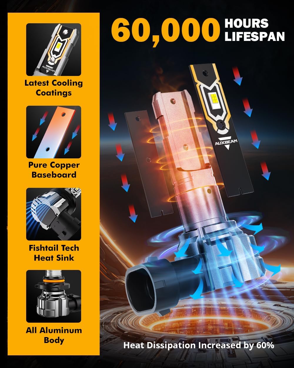 60,000HRS LONG LIFESPAN: Designed with 5-layer cooling system – dual-layer pure copper baseboards + thermally conductive coatings + double large culverts + all-in-one 6063 aviation aluminum shell + fishtail tech heat sinks, the h10 fog light boosts heat dissipation efficiency by 200%; The fanless and sealing design effectively isolates dust and water mist, preventing it failure and greatly reducing wear