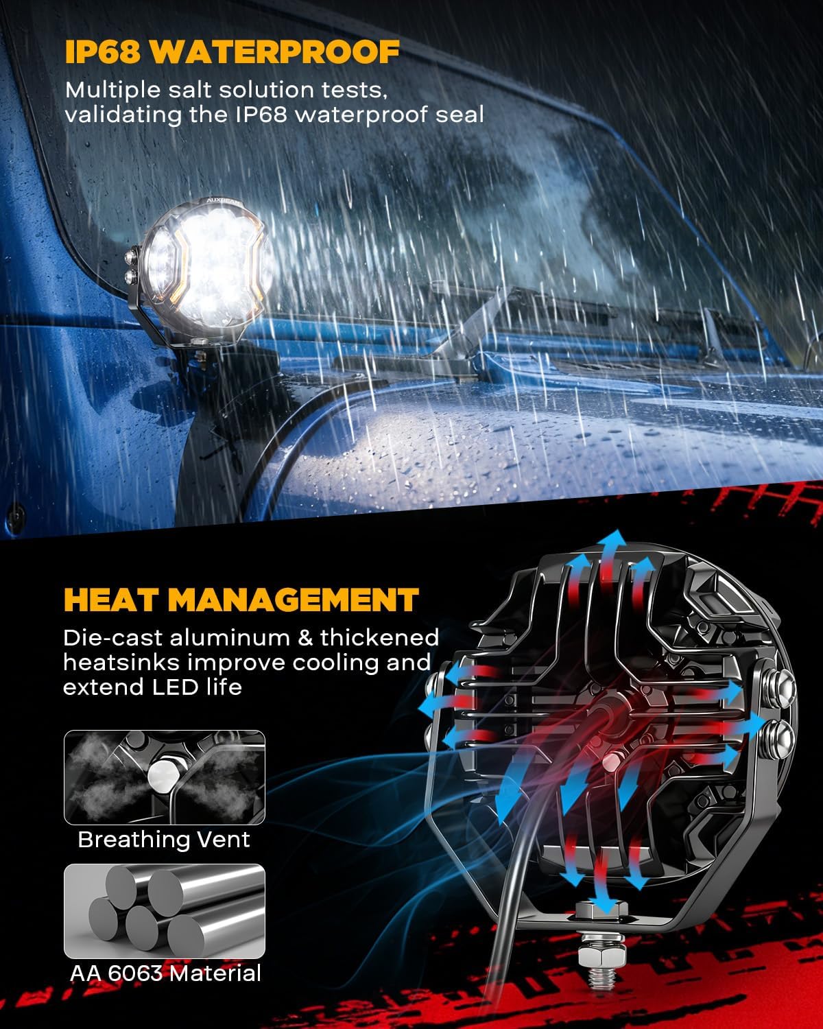 【Battle-Tested, Trail-Ready】Featuring a military breather and aluminum alloy housing boasting thick heat sinks, 5″ led pod lights stay cool under pressure! And don’t forget the attached black light covers—protecting your lenses from scratches and keeping you road-legal—style meets functionality for your off-road escapades