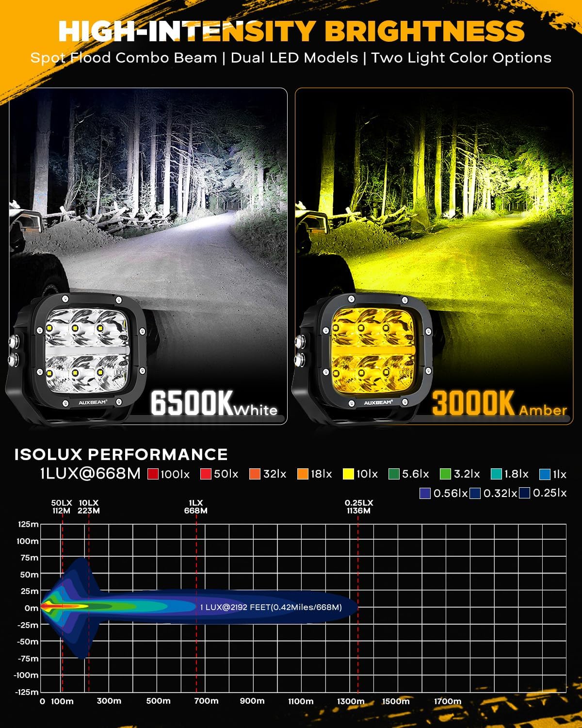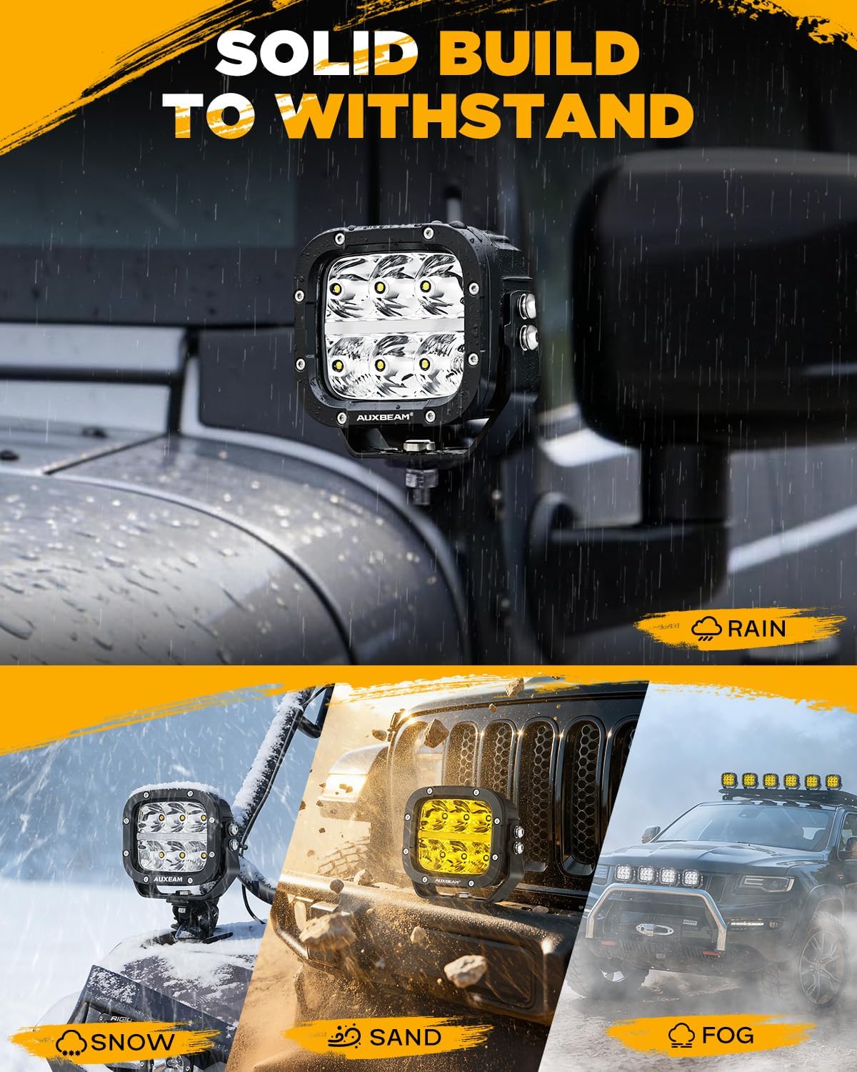 【Up to 500% Brighter with Dual-Color Output】Equipped with three lighting modes, these offroad lights utilize dual-type LED chips to deliver higher brightness and smoother, more consistent light distribution. The optimized spot-and-flood combo beam projects farther down the road while widening peripheral coverage, providing confident illumination through rain, fog, dust, snow, and challenging terrain
