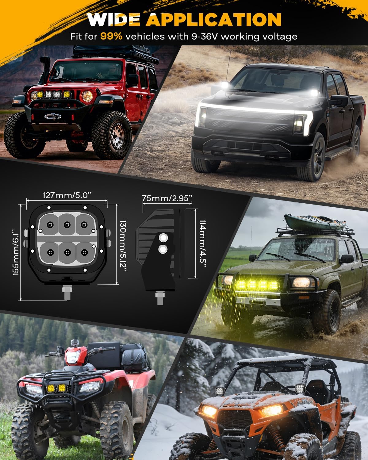 【Enhanced Visibility & Custom Styling】Upgrade both safety and appearance with integrated amber daytime running lights that significantly improve vehicle visibility in low-light and daytime conditions. Combined with removable amber white lens covers, these pod lights allow you to tailor the look of your vehicle while creating a bold, distinctive lighting signature that stands out on and off the road