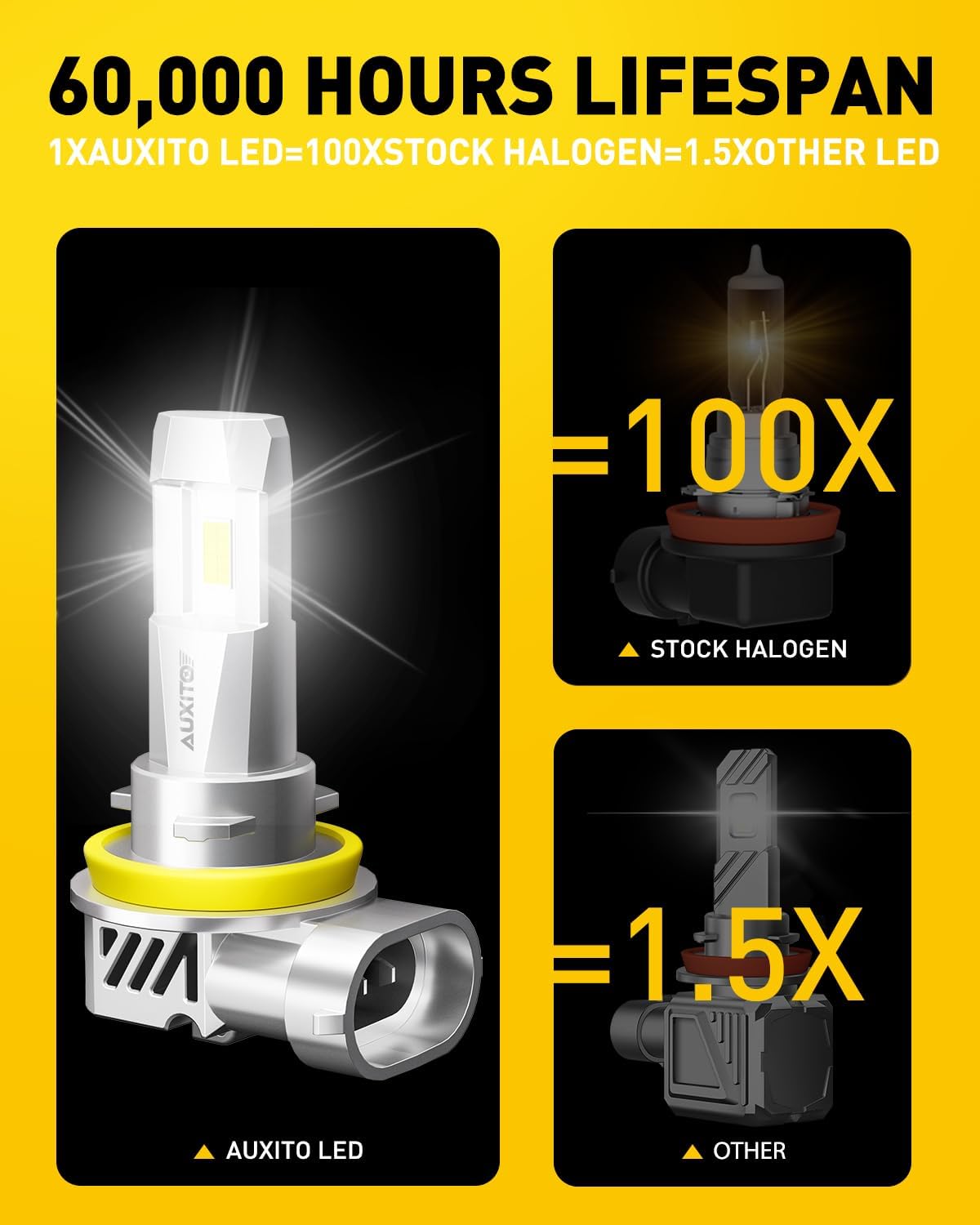 AUXITO h11 9005 fog lights are equipped with high brightness chipsets, 900 times brighter than stock bulbs, provides clearer visibility, make your driving safer at night.