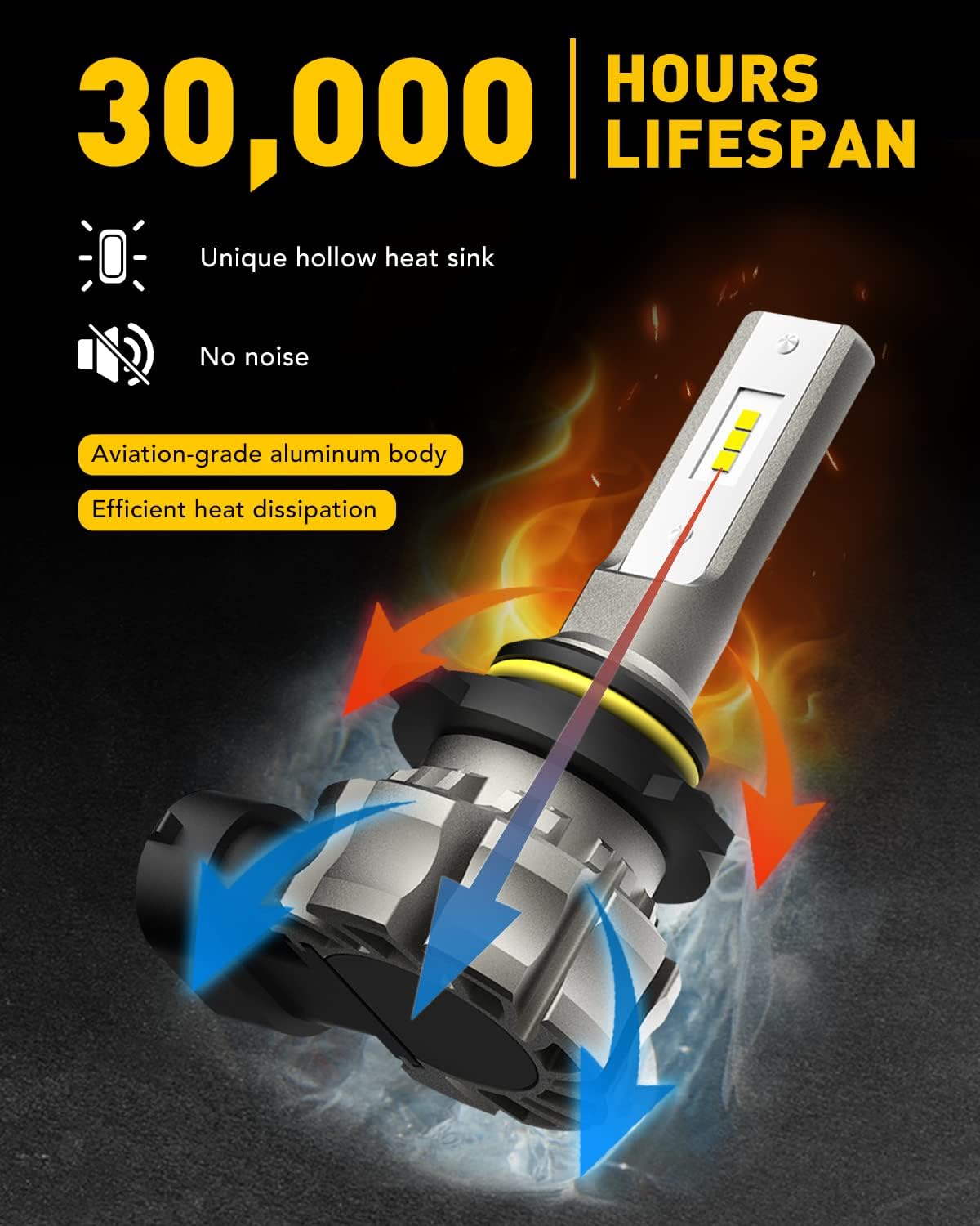 30,000hrs Long Lifespan: Fanless design to avoid dust getting inside and noise. Aviation-grade aluminum body and unique hollow heat sink, providing fast and stable heat dissipation to maximize the lifetime and performance of AUXITO 9145 led bulb.