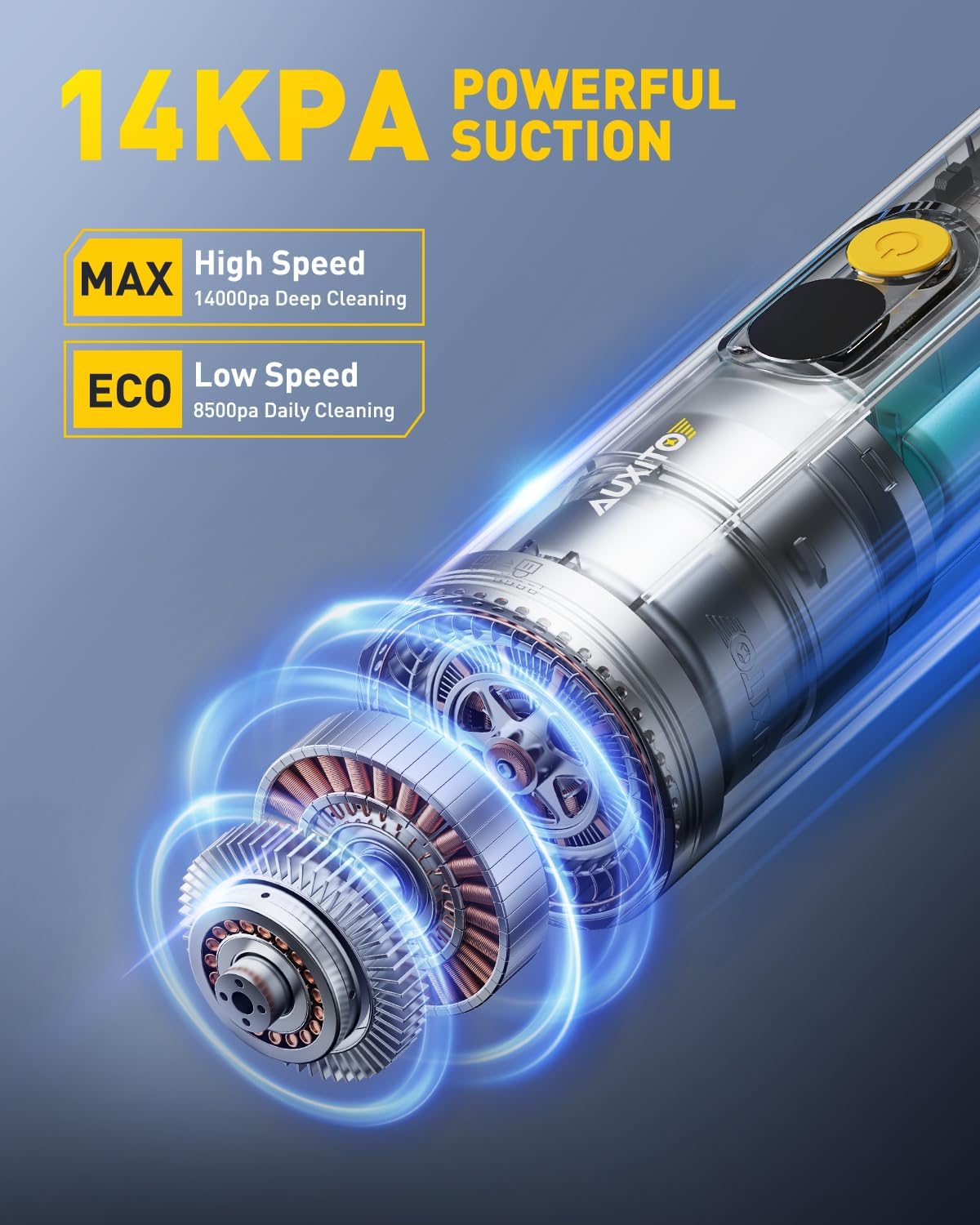 【14000PA HIGH POWER SUCTION HANDHELD VACUUM】The upgraded high-speed brushless motor delivers 14000Pa of powerful suction to quickly and easily pick up stubborn sand, dust, and debris. 2 suction modes of 8500PA and 14000PA are available to meet your different cleaning needs. (If the vacuum cleaner is in a low battery state, you may feel weakened suction power when using the high speed mode, and you need to charge it in time when using the high speed mode continuously.)