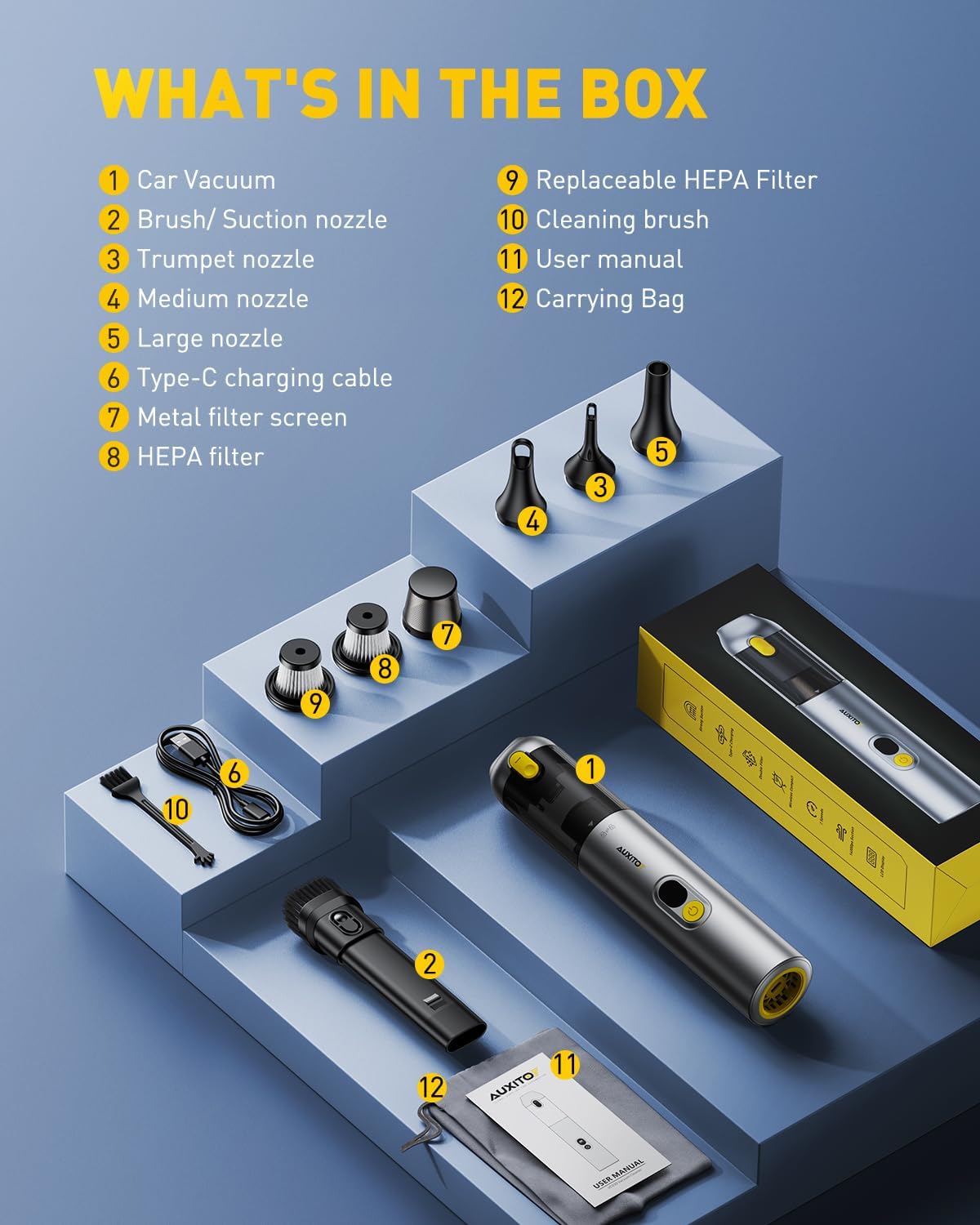【4 IN 1 MULTI-FUNCTIONAL CORDLESS CAR VACUUM】AUXITO Mini Vacuum Car Cleaner is equipped with a variety of nozzles to perfectly meet the different needs of vacuuming, blowing, inflating and pumping. It not only quickly cleans car seats, trunks, floor mats, computer keyboards, sofas, carpets and any hard-to-reach places, but also helps to inflate yoga balls, swimming rings and all inflatable items, and vacuums air for all kinds of vacuum storage bags to save space