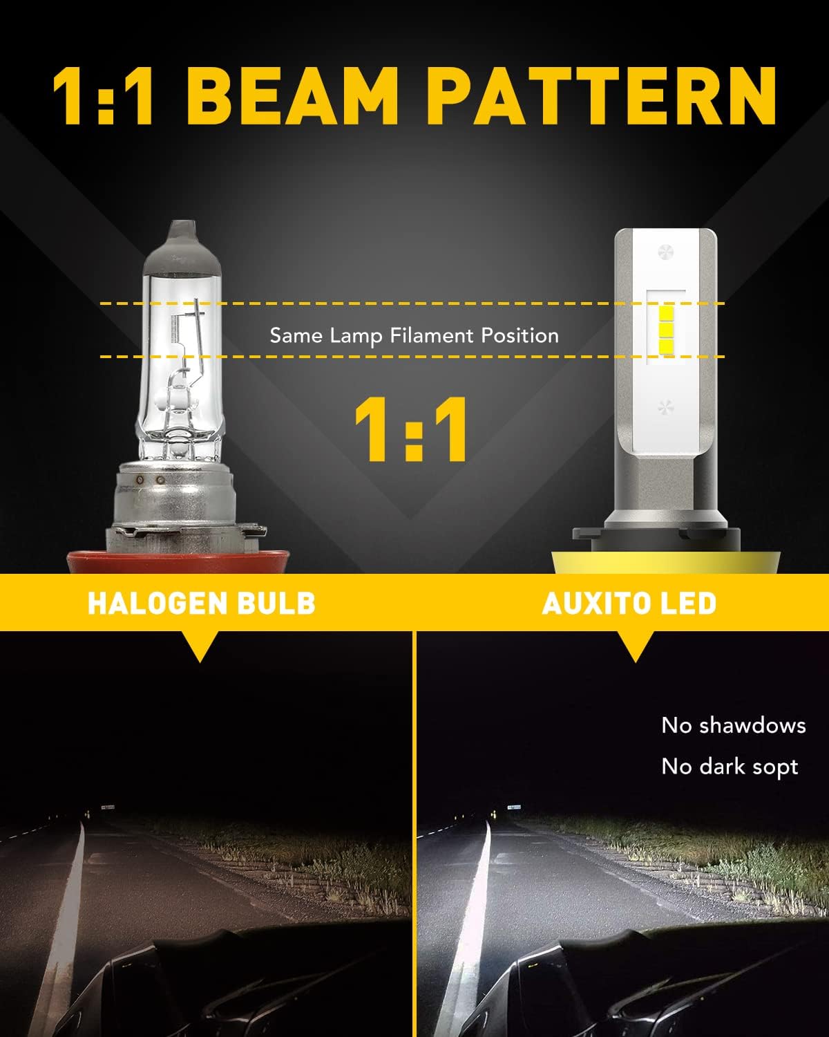 1:1 Safe Beam Pattern: Same light filament position. AUXITO H8 fog light bulb perfectly simulates the factory halogen bulbs’ beam pattern, comes out 360° full angle illumination. No shadows, No dark spots, delivering the more extensive vision and safer driving experience