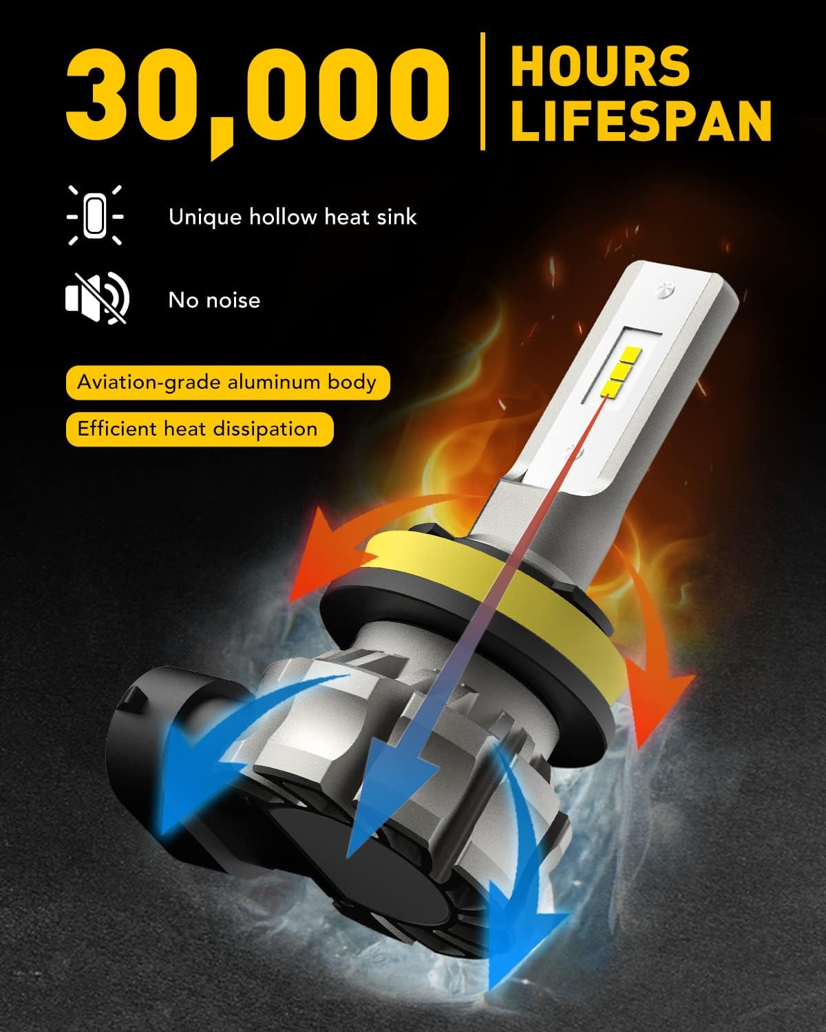 30,000hrs Long Lifespan: Fanless design to avoid dust getting inside and noise. The all-in-one compact design with aviation-grade aluminum material, provides fast and stable heat dissipation to maximize the lifetime and performance of AUXITO H8 fog lights