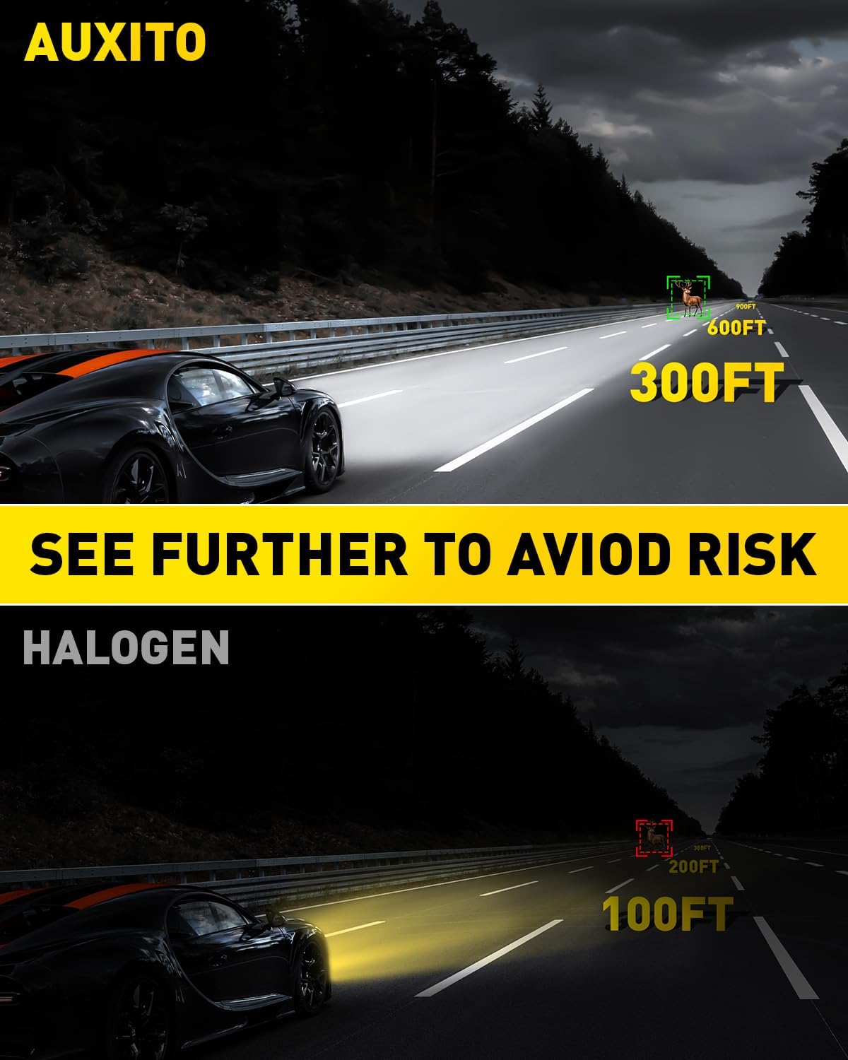 AUXITO 9008 LED bulbs let you achieve unparalleled nighttime safety with 9 times the brightness of halogen bulbs—provides a wider and farther view, helping you detect hazards like rocks or deer earlier on dark country roads