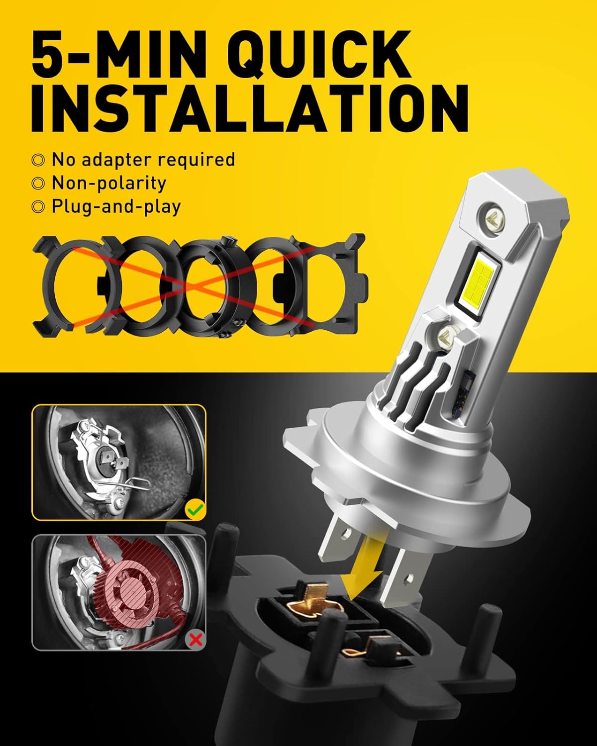 Now AUXITO 2023 version H7 light bulbs have addressed all the concerns you may have. Not only built-in silent fan to achieve 350% brighter than halogen lamp, but also 1:1 design with halogen lamp, no need for specific adapters
