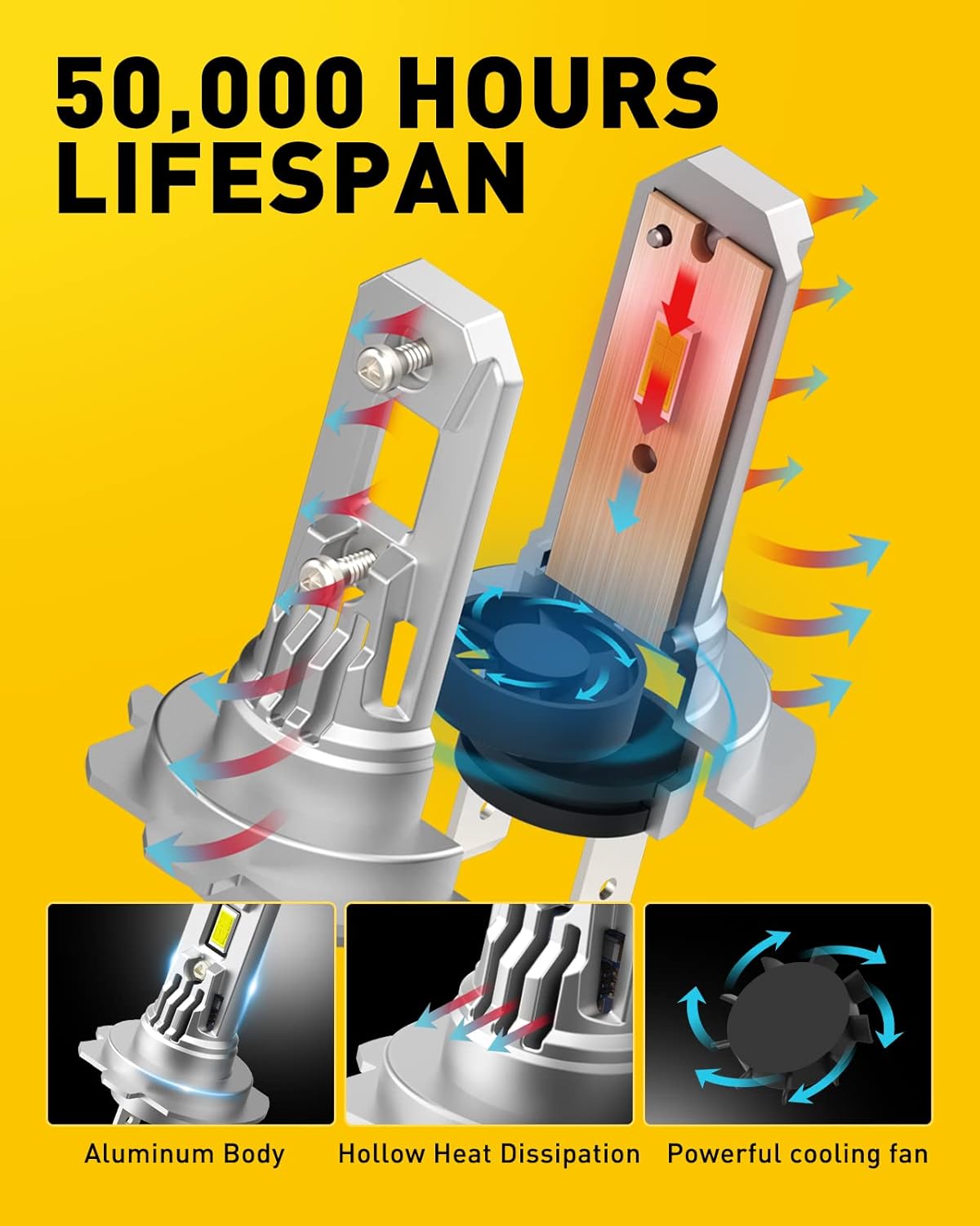 【Efficient Heat Dissipation, 50,000hrs+ Lifespan】AUXITO h7 LED adopts the latest three-stage cooling design, whole aviation aluminum lamp body, hollow heat sink and powerful cooling fan, achieving 50,000 hours of continuous lighting, say goodbye to the trouble of frequent bulb replacement