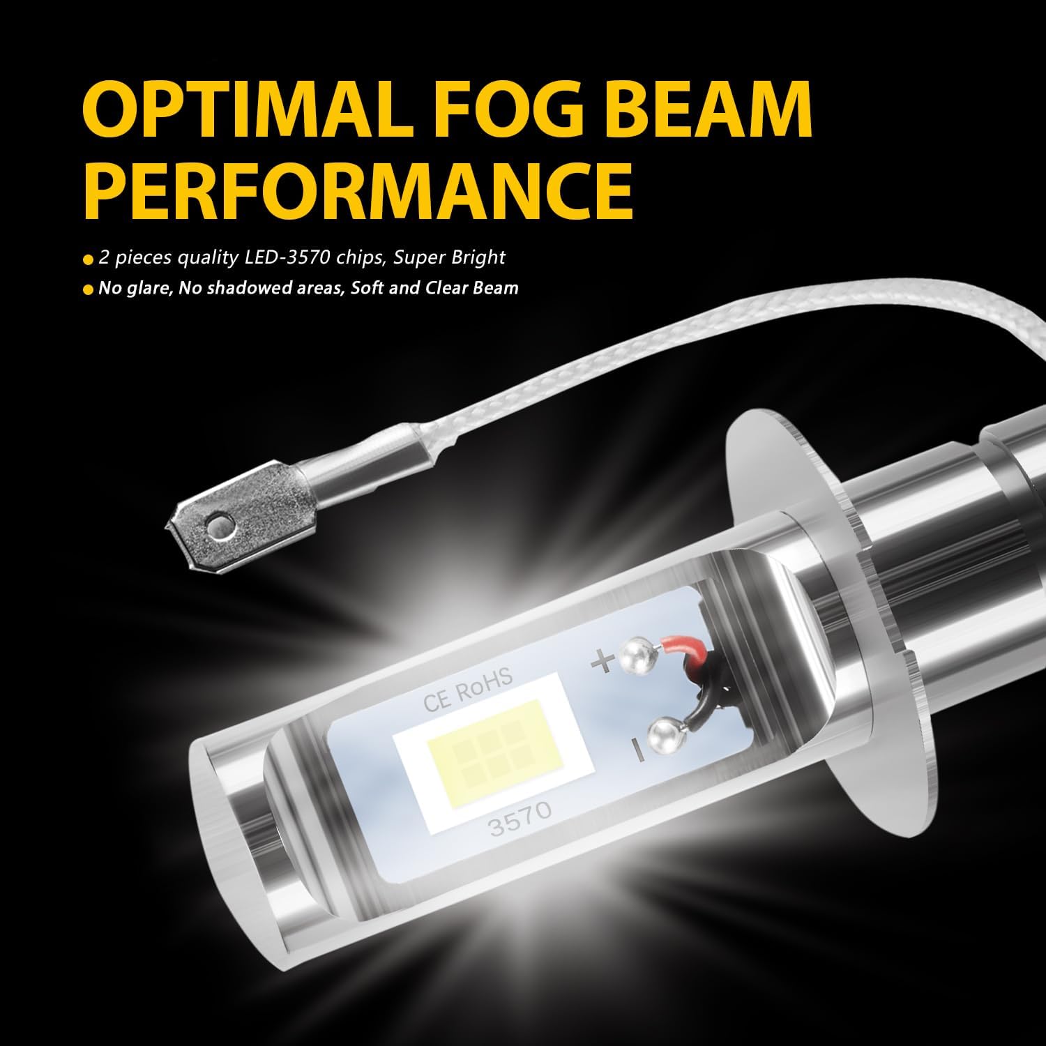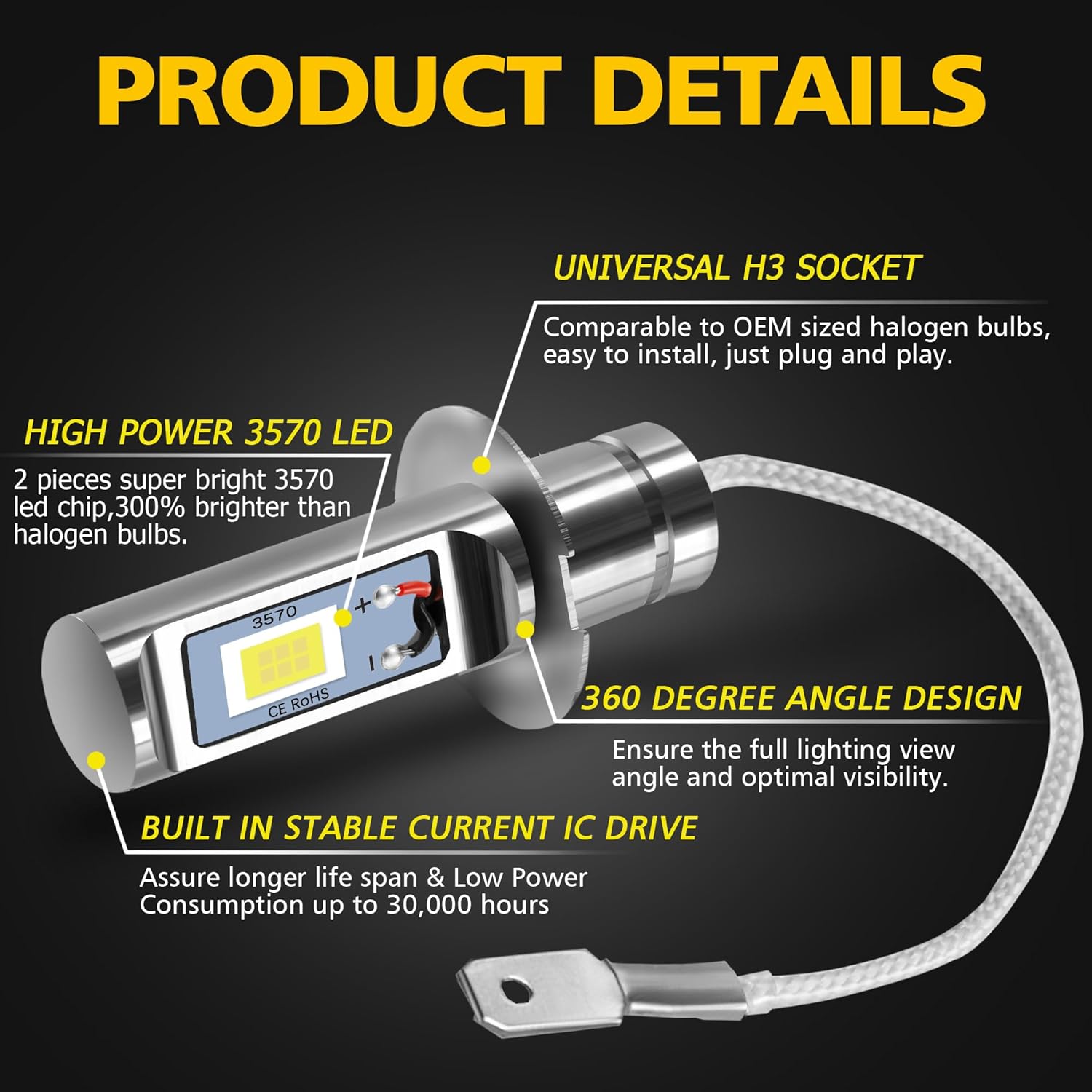 Light Output: Super bright, about 1500 lumens per H3 LED bulb, total 3000 lumens per pair. LED Chip Type: Making with 2 pieces high illumination and high power 3570 LED chips.Beam Angle: Two sides 180 degrees emitting design to offer maximum lighting area.10 Minutes Easy Installation: Non-polarity design, plug and play for 98% vehicle.Application: Cross reference number is H3. Just for fog light/DRL. Not for high/low beam headlights!Package Included: 2 bulbs for H3 LED fog light.