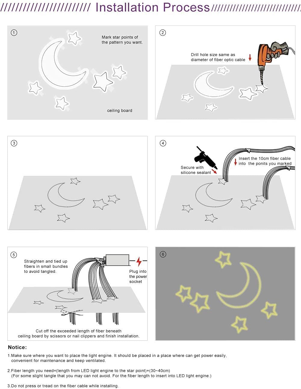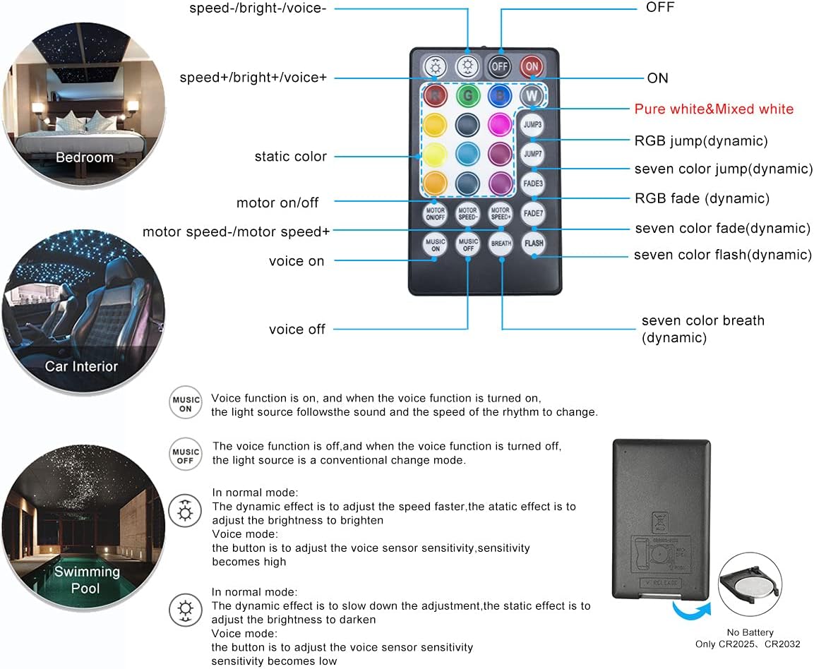 【Twinkle& Music Mode】: the fiber optic light kits combine twinkle and sensor mode function, perfectly providing shining and wonderful lighting effect, and offer 2-year guarantee to satisfy your need, we can customize other size of fiber as you request, plz contact us if you have any problem